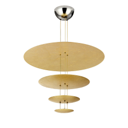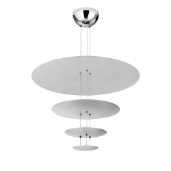 Macchina della Luce Catellani & Smith émerge de la collection Luci d’Oro, qui est née elle aussi en tant que réflexion sur la couleur de la lumière : la lumière dorée du soleil, du feu ; des lumières chaudes, où le concept de réfraction commence à prendre forme dans l’esprit d’Enzo Catellani, qui l’appliquera souvent à d’autres créations. Disques diffuseurs en aluminium revêtus en feuille (disque Ø 120 cm avec feuille libre), tiges en laiton ou aluminium, base nickel. Carte LED 24V CC / 7x6W / classe énergétique F / 4655 lumen / 2700 K / CRI 80. Transformateur 24V CC à basse tension 220-240V dimmable Triac (version dimmable 1-10V ou DALI disponible sur demande). Base Ø 21×10,5 H cm. Tiges H 145 cm variable (sur demande 300 cm). Disques Ø 80-50-30-18 cm. Poids 10 kg.