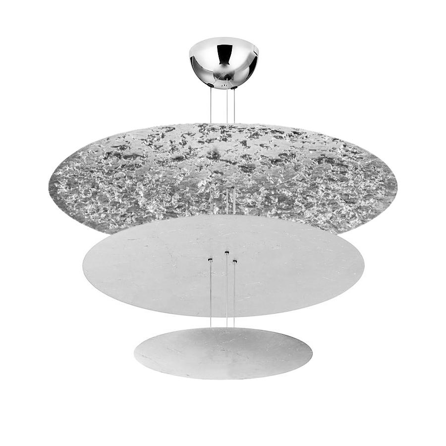 Macchina della Luce Catellani & Smith émerge de la collection Luci d’Oro, qui est née elle aussi en tant que réflexion sur la couleur de la lumière : la lumière dorée du soleil, du feu ; des lumières chaudes, où le concept de réfraction commence à prendre forme dans l’esprit d’Enzo Catellani, qui l’appliquera souvent à d’autres créations. Disques diffuseurs en aluminium revêtus en feuille (disque Ø 120 cm avec feuille libre), tiges en laiton ou aluminium, base nickel. Carte LED 24V CC / 7x6W / classe énergétique F / 4655 lumen / 2700 K / CRI 80. Transformateur 24V CC à basse tension 220-240V dimmable Triac (version dimmable 1-10V ou DALI disponible sur demande). Base Ø 21×10,5 H cm. Tiges H 145 cm variable (sur demande 300 cm). Disques Ø 120-80-50 cm. Poids 13 Kg.