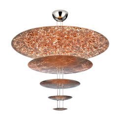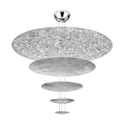 Macchina della Luce Catellani & Smith émerge de la collection Luci d’Oro, qui est née elle aussi en tant que réflexion sur la couleur de la lumière : la lumière dorée du soleil, du feu ; des lumières chaudes, où le concept de réfraction commence à prendre forme dans l’esprit d’Enzo Catellani, qui l’appliquera souvent à d’autres créations. Disques diffuseurs en aluminium revêtus en feuille (disque Ø 120 cm avec feuille libre), tiges en laiton ou aluminium, base nickel. Carte LED 24V CC / 10x6W / classe énergétique F / 6650 lumen / 2700 K / CRI 80. Transformateur 24V CC à basse tension 220-240V dimmable Triac (version dimmable 1-10V ou DALI disponible sur demande). Base Ø 21×10,5 H cm. Tiges H 145 cm variable (sur demande 300 cm). Disques Ø 120-80-50-30-18 cm. Poids 6 kg.