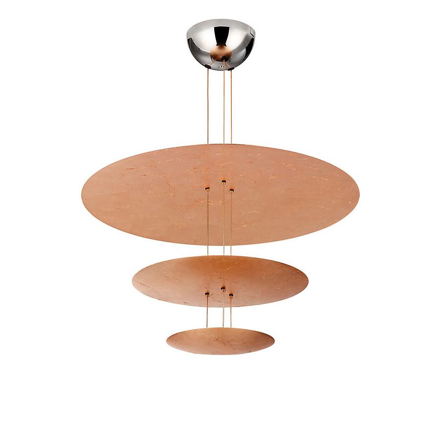 Macchina della Luce Catellani & Smith émerge de la collection Luci d’Oro, qui est née elle aussi en tant que réflexion sur la couleur de la lumière : la lumière dorée du soleil, du feu ; des lumières chaudes, où le concept de réfraction commence à prendre forme dans l’esprit d’Enzo Catellani, qui l’appliquera souvent à d’autres créations. Disques diffuseurs en aluminium revêtus en feuille (disque Ø 120 cm avec feuille libre), tiges en laiton ou aluminium, base nickel. Carte LED 24V CC / 5x6W / energy class F / lumen 3325 lumen / 2700 K / CRI 80. Transformateur 24V CC à basse tension 220-240V dimmable Triac (version dimmable 1-10V ou DALI disponible sur demande). Base Ø 21×10,5 H cm. Tiges H 145 cm variable (sur demande 300 cm). Disques Ø 80-50-30 cm. Poids 8 kg.