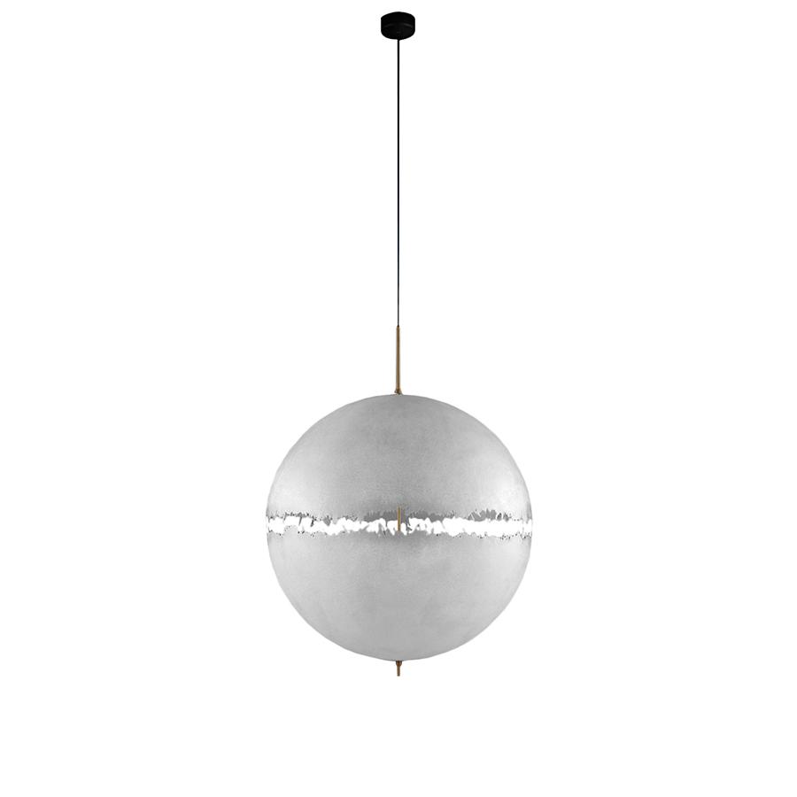 Avec PostKrisi Enzo Catellani commence à travailler et à modeler la fibre de verre. Cette matière le fascine par son incroyable polyvalence et par sa résistance, mais surtout par les jeux d’ombres qu’elle crée lorsqu’elle interagit avec la lumière. Base en métal, tige en laiton ou métal nickelé, diffuseur en fibre de verre.