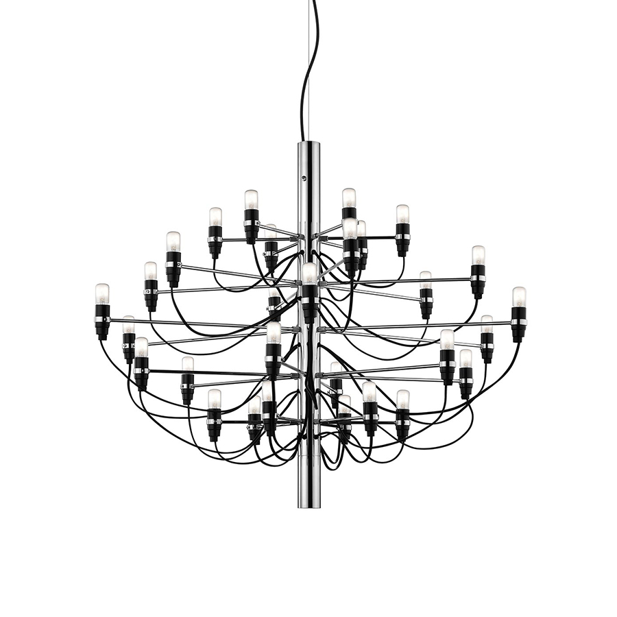 La lampe suspension 2097/30 Flos inventée par Gino Sarfatti est une touche d'élégance parfaite pour les maisons modernes. Sarfatti a conçu la suspension 2097/30 Flos avec l'intention de moderniser une suspension avec un style d'époque. Il joue avec des effets de lumière, nous suggérant avec la 2097/30 Flos des bougies soutenues par les structures classiques des années passées. Grâce à cet artifice réussi, le lustre acquiert donc une importance incomparable. Avec sa structure centrale résistante en fer et ses bras recourbés en cuivre qui rappellent comme une embrassade, la lampe s'impose comme protagoniste de la pièce en nous regardant tous de haut. Les 30 ampoules, en brillant comme des petites étoiles émettent une agréable lumière diffuse qui enveloppe la pièce de manière unique.