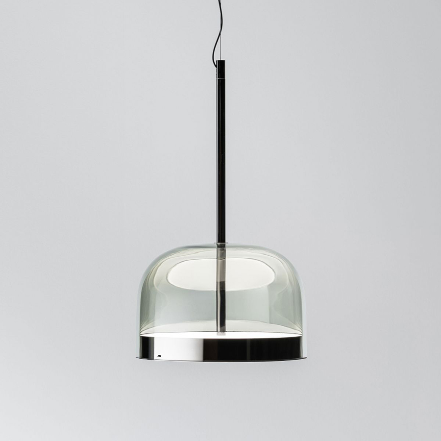 Equatore Fontana Arte: réinterprétation avec un goût contemporain des lampes classiques avec abat-jour en verre. Si, dans les abat-jour traditionnels, le diffuseur contient la source lumineuse, dans cette famille de lampes, il est paradoxalement et suggestive ment vide et l’effet lumineux est produit par deux disques lumineux situés à l'intérieur d'une bande métallique centrale, visible sur l’abat-jour et rappelant la ligne de l’Équateur. La lumière produite par les leds, grâce aux écrans intérieurs disposés en couches, se distribue régulièrement sur la surface des disques, en les faisant rayonner d’une lumière magique. Le disque inférieur produit une émission lumineuse vers le bas, tandis que le disque supérieur éclaire la calotte de verre, pour donner une diffusion douce de la lumière. Disponible en versions de table, de sol et à suspension. Ampoule intégrée non remplaçable LED 40W (2700K, CRI>90, 4500Lm).