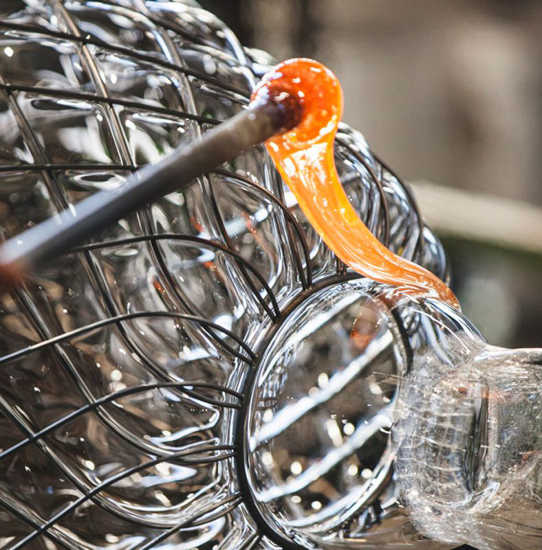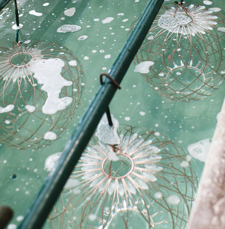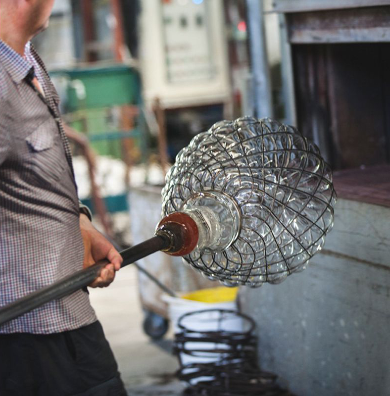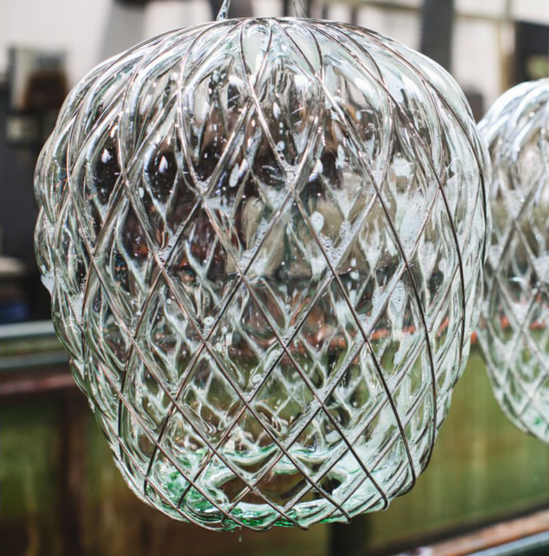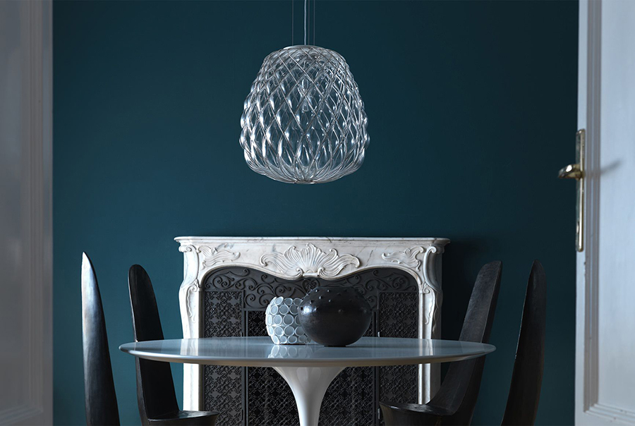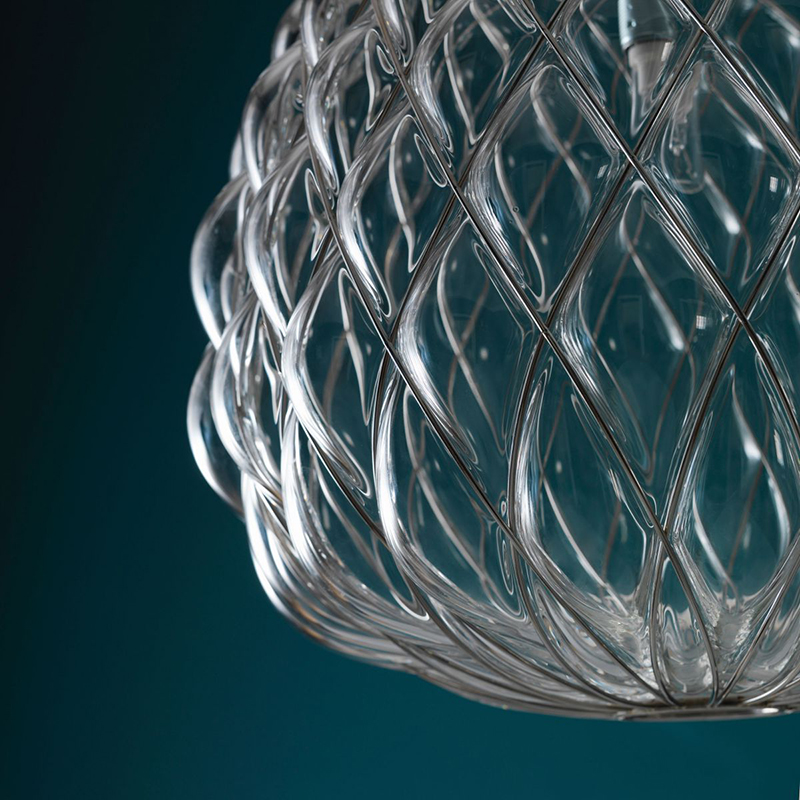 Pinecone est aussi bien une suspension qu'une lampe à poser. Caractérisée par un diffuseur en verre soufflé, elle est disponible dans la version transparente et brillante ou dans la version blanc laiteux acidé.Le diffuseur est réalisé selon une ancienne technique du verre soufflé en cage : le maître verrier souffle à la bouche la bulle de verre dans une cage métallique qui en retient partiellement l'expansion naturelle. Le produit final semble ainsi sortir de la cage tout en y restant emprisonné et crée un jeu de tension qui génère un objet suspendu au moment où il tente de se dégager ; la cage est embellie par un traitement galvanique qui lui confère un aspect lustré et brillant.La version transparente permet notamment à l'observateur de lire une structure à deux niveaux en multipliant l'effet scénographique alors que l'entrelacement de la cage métallique projette sur les surfaces environnantes un jeu d'ombres kaléidoscopique. La version en blanc suit par contre délicatement la cage et en souligne les géométries en générant une lumière diffuse élégante et agréable.Éclairé par une source lumineuse que l'utilisateur final peut choisir, ce luminaire est fortement suggestif et impactant aussi bien éteint qu'allumé. Ampoules exclue (1x max 150W 230V E27 (HA, FL, LED)).