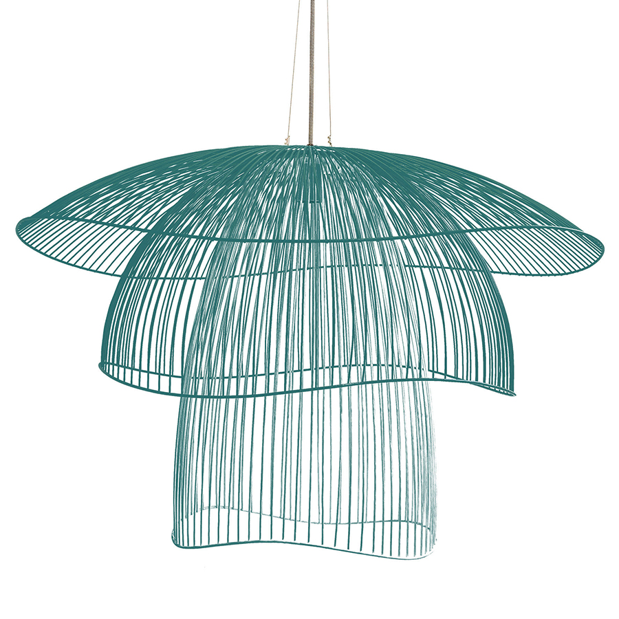 Toute la légèreté de Papillon Forestier est obtenue par la superposition de 3 carcasses. Les fils de métal de chacune d’elles sont multipliés puis vrillés pour obtenir cet effet graphique et cinétique rappelant celui du battement d’aile d’un papillon. Suspension composée de 3 carcasses en métal superposée, équipée d'une cordelière textile.