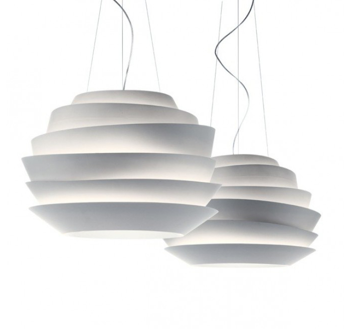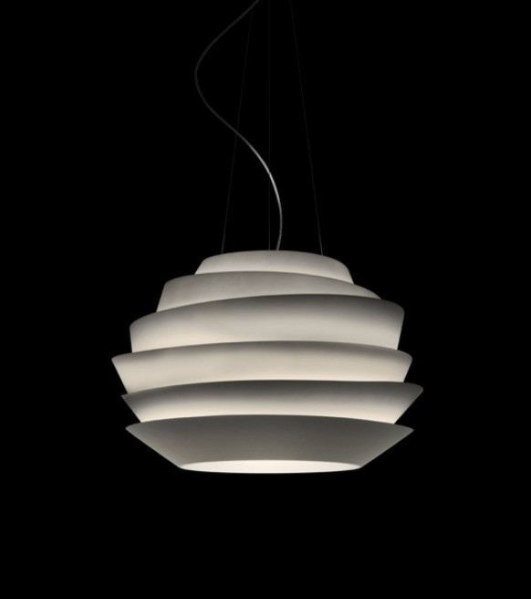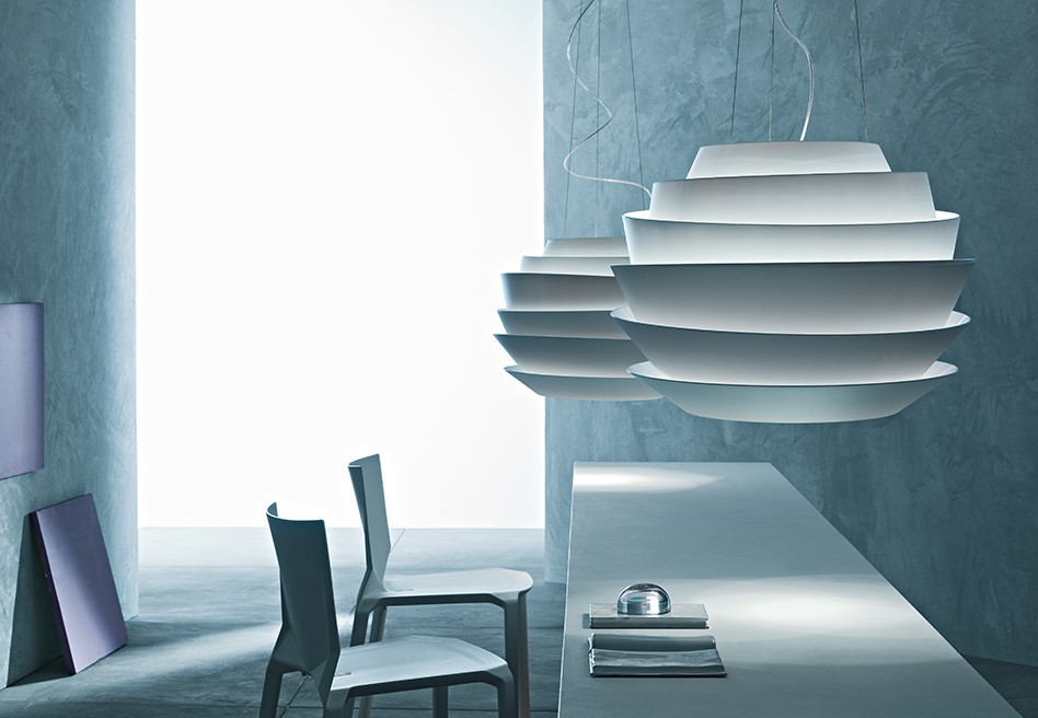 Le Soleil Foscarini est une lampe à suspension réalisée en polycarbonate moulé à injection, matériel qui ne fait pas transparaître complètement la lumière et aide à créer l'effet lumineux spécial de Le Soleil, avec des faisceaux de lumière projetés vers le haut et avec un éclairage direct vers le bas.
