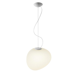 La forme de Gregg est le fruit d’une inspiration naturelle et d’une recherche approfondie. Elle fait penser à un grand galet poli par l’eau, ou bien à l’oeuf d’un animal mythologique, symbole de création et de régénération. Un volume pur et familier dans sa facilité d’interprétation, et pourtant surprenant, car la forme asymétrique de Gregg change d’image selon le point de vue de la personne qui l’observe. Une solution inédite pour décliner un matériau traditionnel comme le verre devient ainsi un instrument dans les mains du créateur pour apporter un caractère original au milieu environnant. Trois dimensions différentes dans les versions à suspension, de table, plafonniers et appliques: la collection Gregg est un modèle absolument parmi les plus versatiles et transversaux, en s’intégrant avec facilité au sein de tout type de contexte. Dans le milieu domestique, la lumière chaude et uniforme irradiée par le diffuseur satiné blanc et le style essentiel ont une forte valeur fonctionnelle et décorative. Le blindage de l’ampoule dans toutes