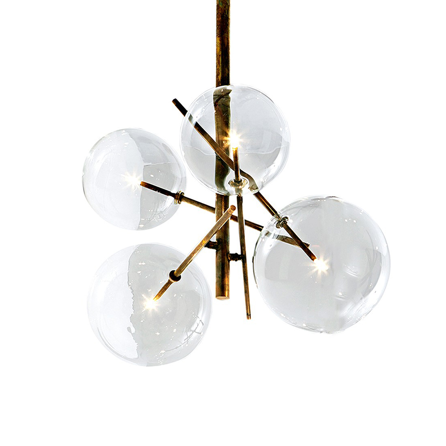 La lampe à suspension Bolle Gallotti & Radice a été conçue par Massimo Castagna en 2014 et est disponible en deux versions, à 4 ou 6 sphères. Les sphères de la lampe Bolle sont en cristal transparent soufflé à la bouche. L'axe et les tiges sont en laiton poli à la main, naturellement coloré et inhomogène. Son savoir-faire confère à chaque pièce une particularité qui la rend exclusive. Non dimmable. Version avec 4 sphères.