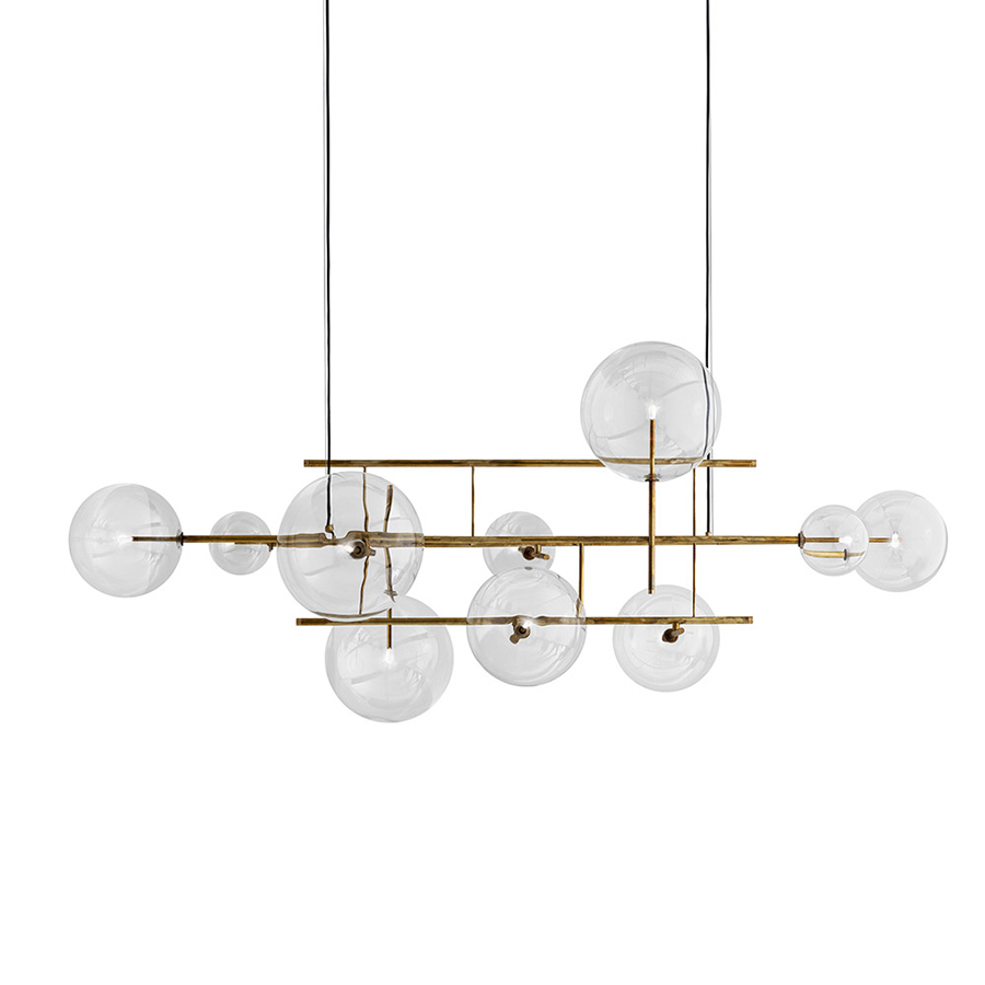 Bolle Orizzontale Gallotti&Radice est une lampe à suspension avec dimmable lumière LED. 10 boules en verre soufflé transparent. Parties métalliques en laiton bruni à la main. Le laiton bruni à la main est naturellement taché et pas uniforme. Câble de 4mt inclus.