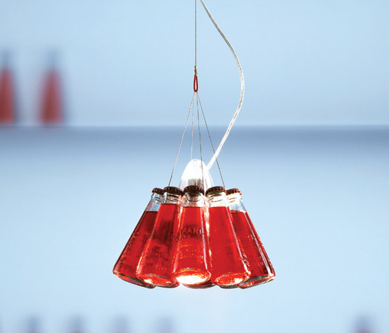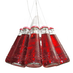 La lampe suspension Campari Light est conçu par le designer Raffaele Celentano et est suspendu par un câble en plastique transparent qui est fourni avec un câble qui se termine à l'une des 10 bouteilles à titre de conférencier.