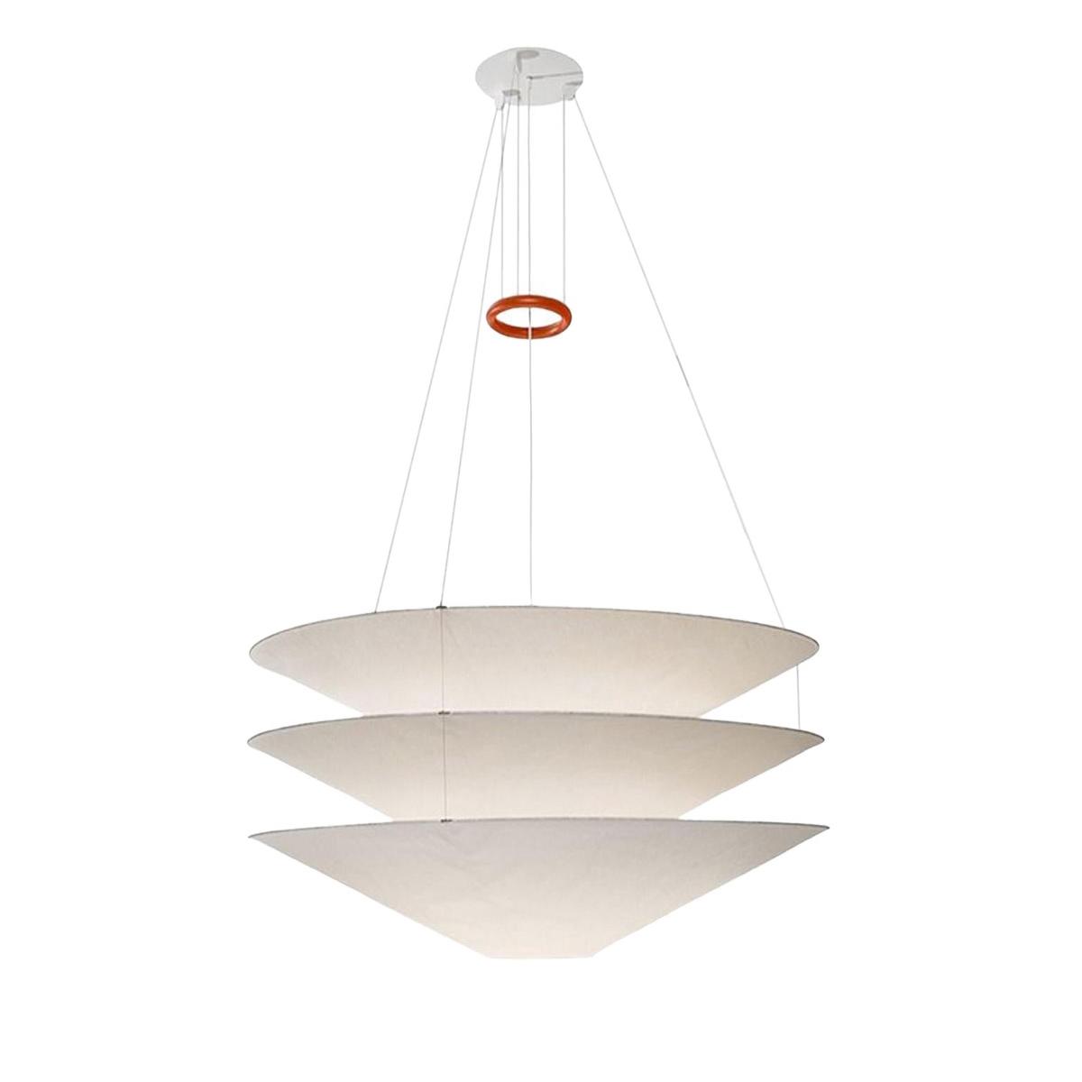 Floatation Ingo Maurer est une lampe à suspension réalisée avec du papier japonais et du métal. Anneau rouge en fer pour régler la hauteur, baldaquin en métal laqué blanc. Le matériel très sensible réagit à l'humidité ambiante. Aussi le papier peut légèrement se détendre. Ces produits ne sont pas appropriés pour des pièces avec un fort taux d'humitié. Lors de la commande, il est nécessaire de préciser la distance entre le plafond et le diffuseur inférieur. Bulbs not included: 1 x E27 PAR30 max 100W (downlight), 2 x E27 max 60W, 2 x E27 max 40W.