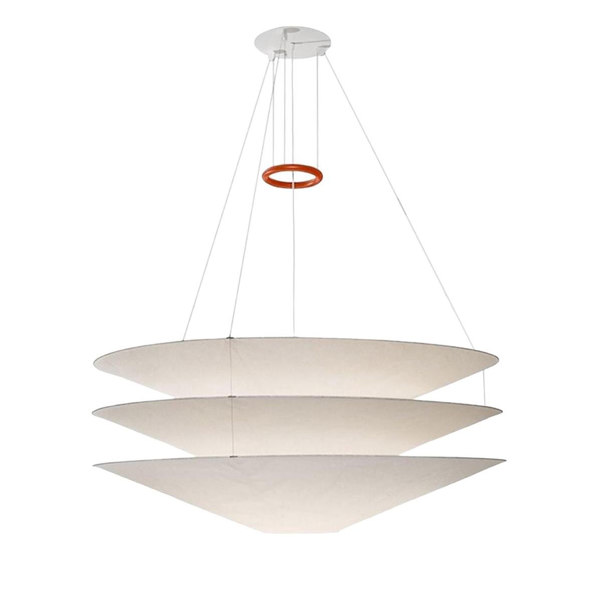 Floatation Ingo Maurer est une lampe à suspension réalisée avec du papier japonais et du métal. Anneau rouge en fer pour régler la hauteur, baldaquin en métal laqué blanc. Le matériel très sensible réagit à l'humidité ambiante. Aussi le papier peut légèrement se détendre. Ces produits ne sont pas appropriés pour des pièces avec un fort taux d'humitié. Lors de la commande, il est nécessaire de préciser la distance entre le plafond et le diffuseur inférieur. Bulbs not included: 1 x E27 PAR30 max 100W (downlight), 2 x E27 max 60W, 2 x E27 max 40W.