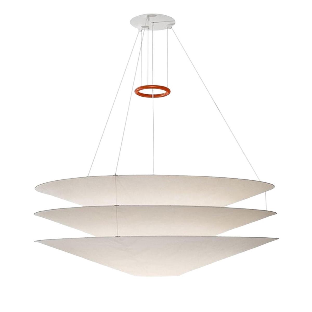 Floatation Ingo Maurer est une lampe à suspension réalisée avec du papier japonais et du métal. Anneau rouge en fer pour régler la hauteur, baldaquin en métal laqué blanc. Le matériel très sensible réagit à l'humidité ambiante. Aussi le papier peut légèrement se détendre. Ces produits ne sont pas appropriés pour des pièces avec un fort taux d'humitié. Lors de la commande, il est nécessaire de préciser la distance entre le plafond et le diffuseur inférieur. Bulbs not included: 1 x E27 PAR30 max 100W (downlight), 2 x E27 max 60W, 2 x E27 max 40W.