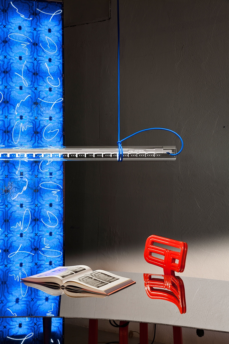 Tubular Ingo Maurer est une lampe en verre multifonctionnelle. Sebastian Hepting de l'équipe d'Ingo Maurer utilise un tube non traité en verre borosilicate pour la lampe. Le tube en verre de la lampe suspendue peut être tourné à 360° et peut être utilisé comme downlight, uplight ou wallwasher. Tubular est disponible chez Ingo Maurer avec une lamelle rouge et un câble rouge ou avec une lamelle blanche et un câble bleu. Les câbles d'autres couleurs peuvent être raccordés par des spécialistes. Les extrémités ouvertes et polies au feu soulignent le design puriste et son caractère artisanal. Alors que l'une des suspensions du tube est presque invisiblement constituée d'un fil fin, l'autre extrémité est doucement encastrée dans une boucle textile. À l'intérieur, une construction de lattes en forme de filigrane reflète la lumière dans toutes les directions. La source de lumière est invisiblement cachée derrière la structure lumineuse. Grâce à sa polyvalence, le luminaire suspendu "Tubular" convient à différents usages et pièces - que ce soit comme éclairage de table à la maison, dans les restaurants, au-dessus d'un bar, dans la cuisine, à la réception ou au bureau. LED intégrée 26,8W 3000K 1647lm CRI>90 Classe C, dimmable, variateur non inclus. Longueur de câble: 300 cm.