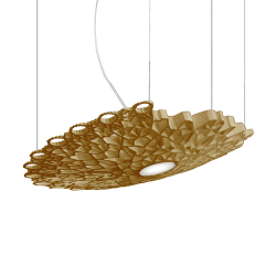 Évoquer le charme de la lumière naturelle qui irradie par les rosaces des cathédrales gothiques... Dans Notredame Karman coexistent présent et future, forme et lumière: la qualité poétique cache une âme technologique en réveillant émotions très anciennes. Notredame Karman se teint d'or pour devenir protagoniste même des milieux les plus élégants et sophistiqués. La nouvelle coloration, grâce aux reflets métalliques, souligne les effets de la lumière entre les pleins et vides de sa texture tridimensionnelle. LED integrée 24V, 16W, 1800 lm (frontal:13W 1520 lm) (backlight:3W,280 lm), CRI=80, class A+, cut phase dimmable