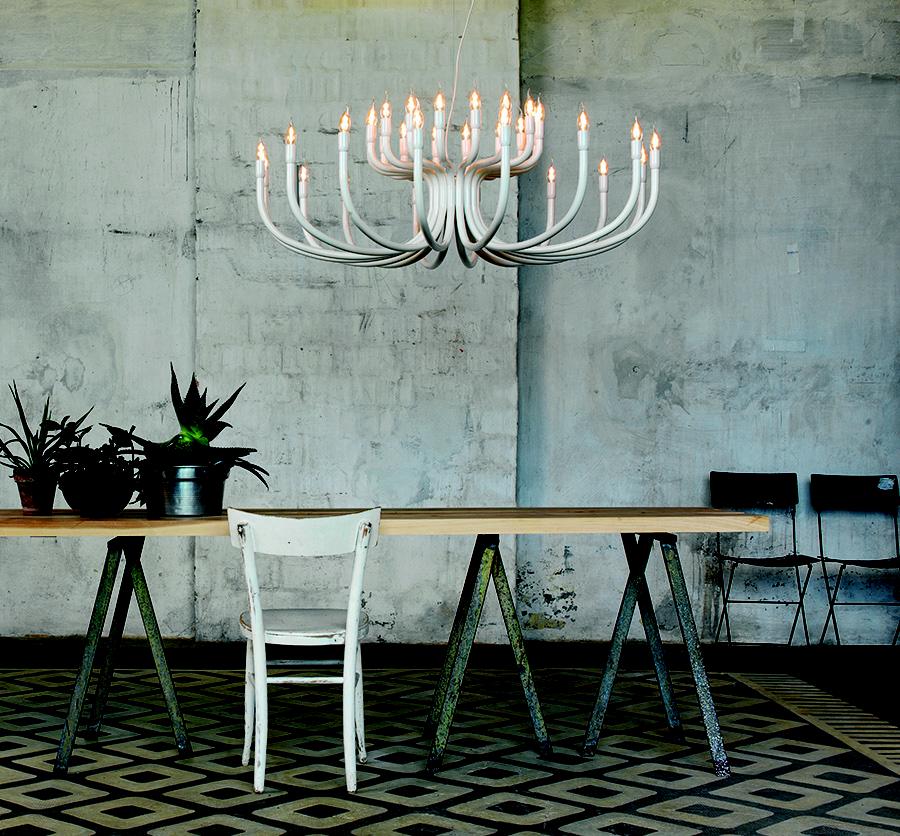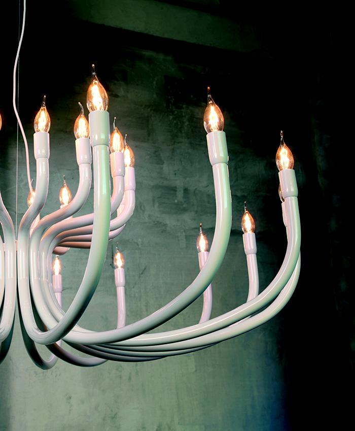 Sa silhouette rappelle les lustres qui dominent les palais riches et baroques de la noblesse sicilienne, rappelant l'ocelot ; mais sa métamorphose vers la propreté la plus extrême fait que Snoob peut être placée n'importe où tout en gardant toujours sa grandeur. Des bras aux lignes épurées et harmonieuses qui s'épanouissent vers le haut en dirigeant la lumière dans tous les coins de l'environnement. Structure en aluminium laqué blanc ou noir ou RAL personnalisable sur demande. Ampoules non fournies: E14 32 x max 42W