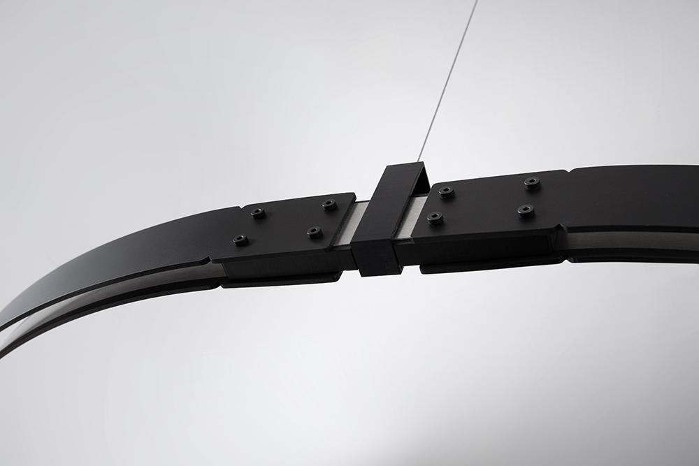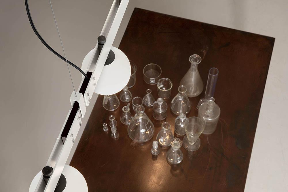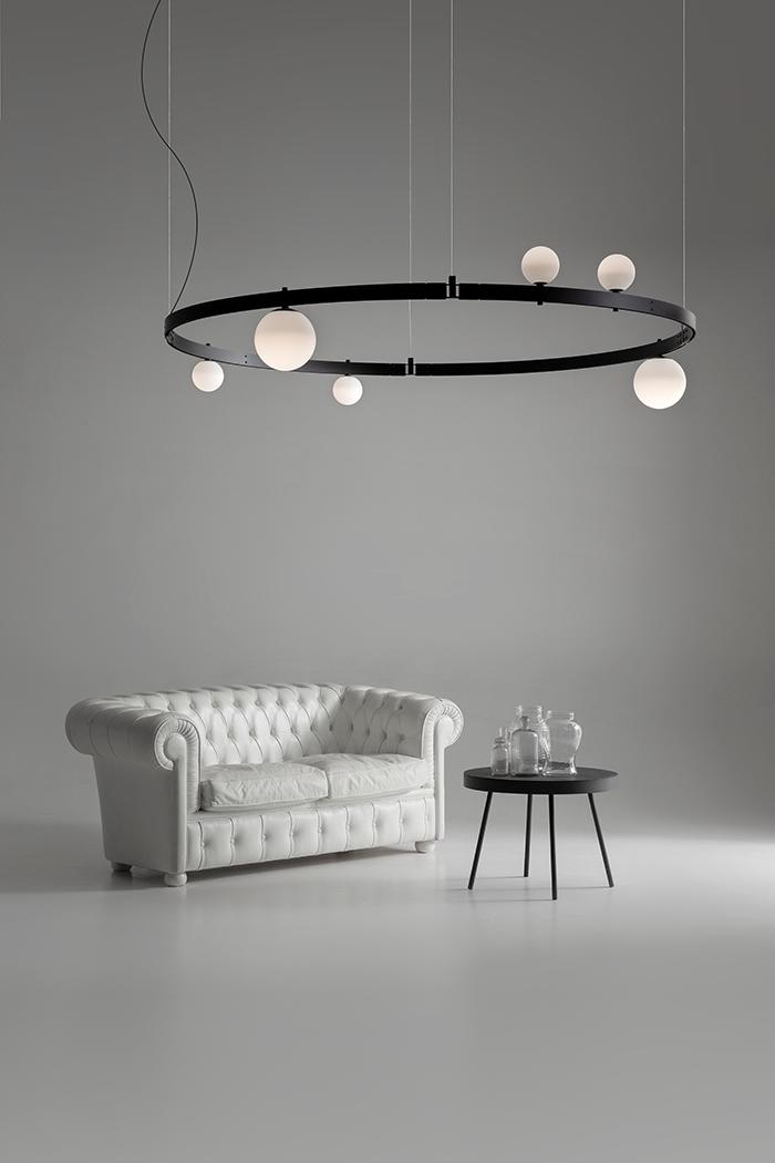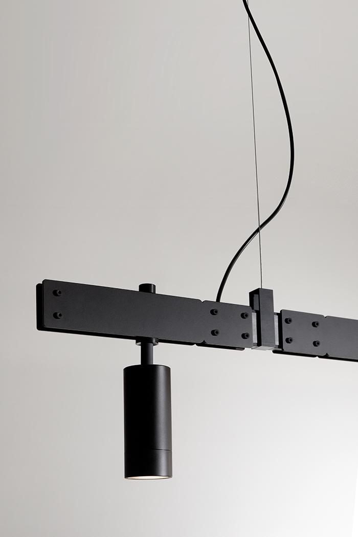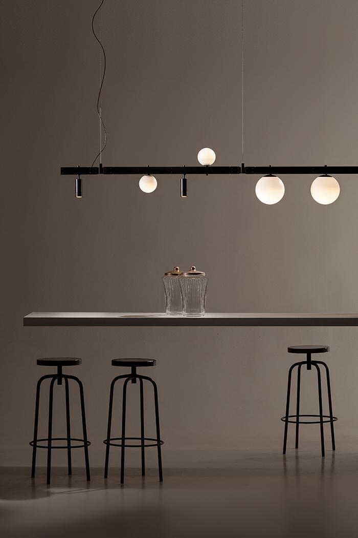 KARMAN lampe à suspension STANT. Un jeu de mots… De Etant, participe présent de Etre. C'est ce qui est, reste tandis que tout change, évolue, involue. Formes géométriques propres et une technologie sophistiquée. Barres portantes qui rappellent les structures d'ingénierie du passé. Structures modulaires électrifiées qui permettent l'insertion de corps d'éclairage (sphères en verre soufflé et projecteurs) en quantité et disposition libre, sans l'utilisation de câbles électriques d'alimentation. Maximale liberté expressive. LEDs intégrés.