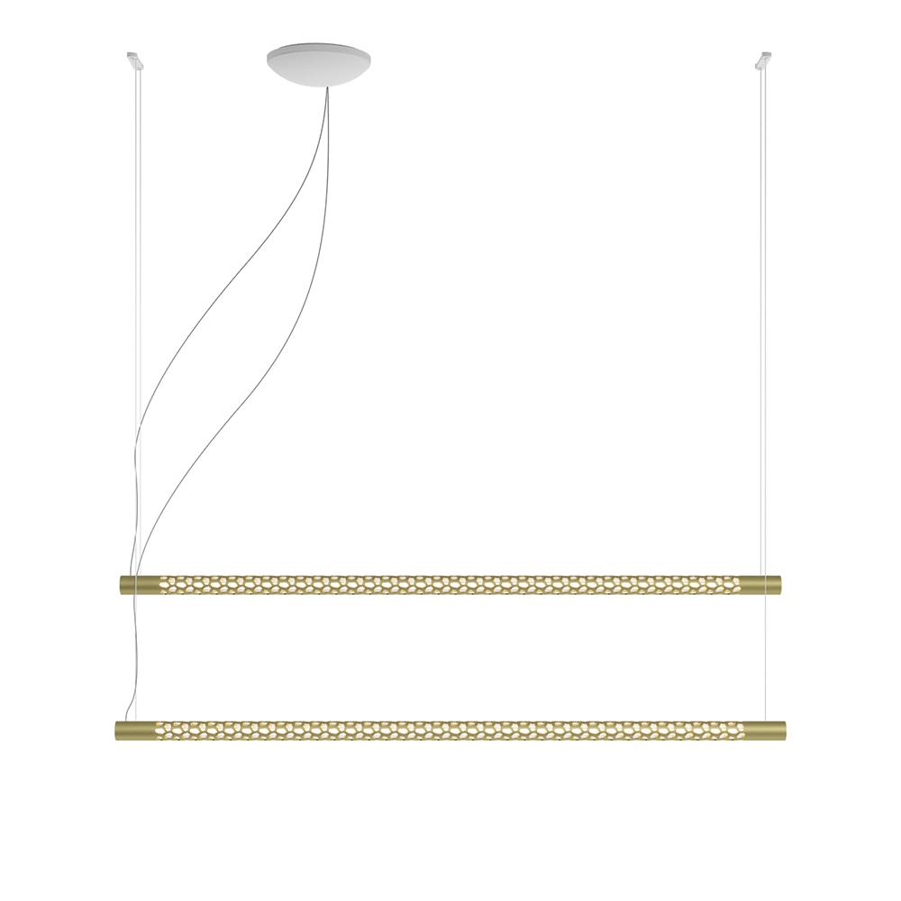 Squiggle H10 Rotaliana s'inspirant de la "Structure au néon" de Lucio Fontana pour la IX Triennale de Milan, Squiggle est un exosquelette tubulaire pendu au plafond qui cache une longue bande LED faisant jusqu'à 6 mètres. Une séquence d’ouvertures de forme d'hexagonale irrégulière allège la structure métallique en donnant lieu à des images géométriques très différentes les unes des autres: des lignes courbes cassées, le symbole de l'infini, des anneaux concentriques de plusieurs tailles. Power LED integrée 72W 3000K 5050lm CRI 90.