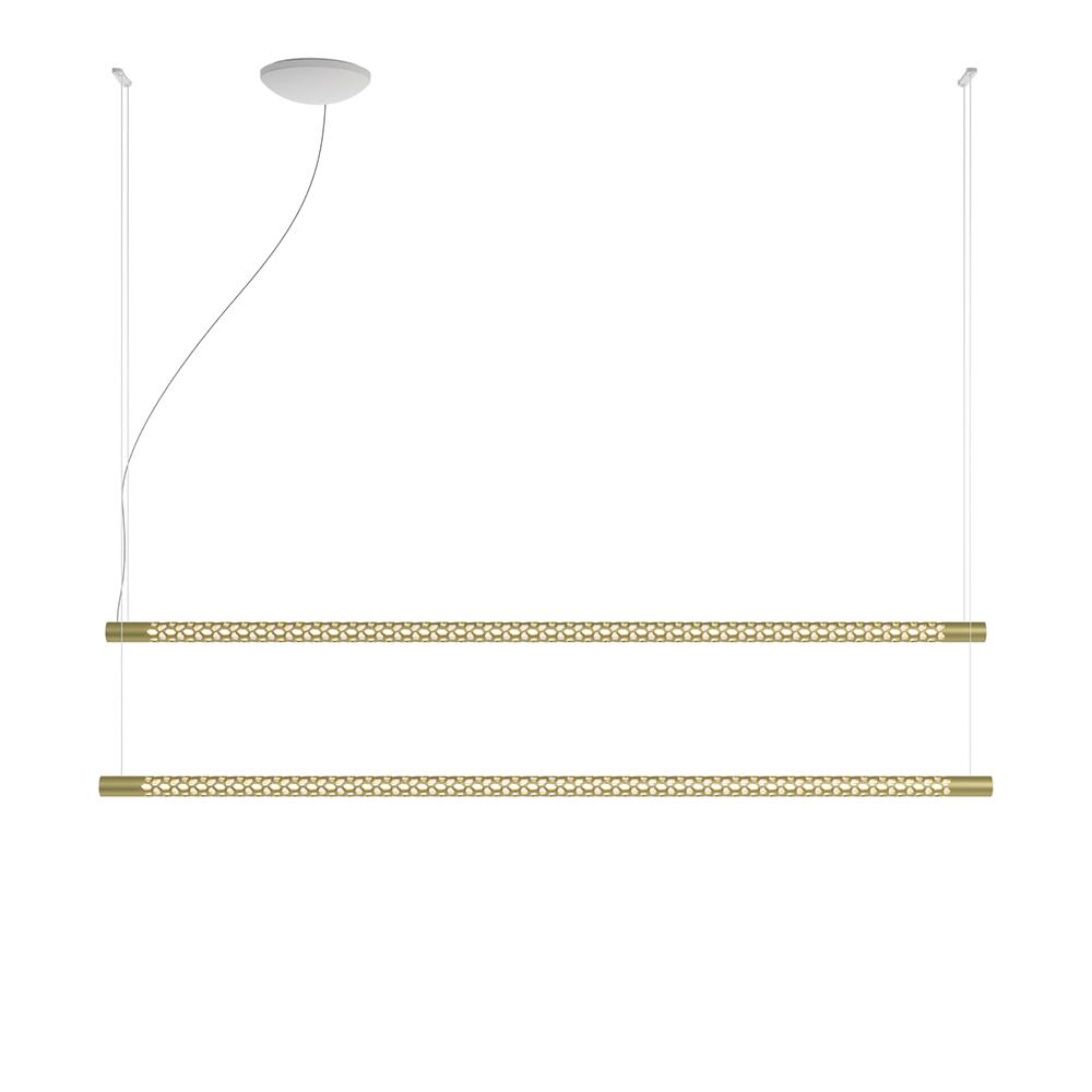 Squiggle H11 Rotaliana s'inspirant de la "Structure au néon" de Lucio Fontana pour la IX Triennale de Milan, Squiggle est un exosquelette tubulaire pendu au plafond qui cache une longue bande LED faisant jusqu'à 6 mètres. Une séquence d’ouvertures de forme d'hexagonale irrégulière allège la structure métallique en donnant lieu à des images géométriques très différentes les unes des autres: des lignes courbes cassées, le symbole de l'infini, des anneaux concentriques de plusieurs tailles. Power LED integrée 78W 3000K 5500lm CRI 90.