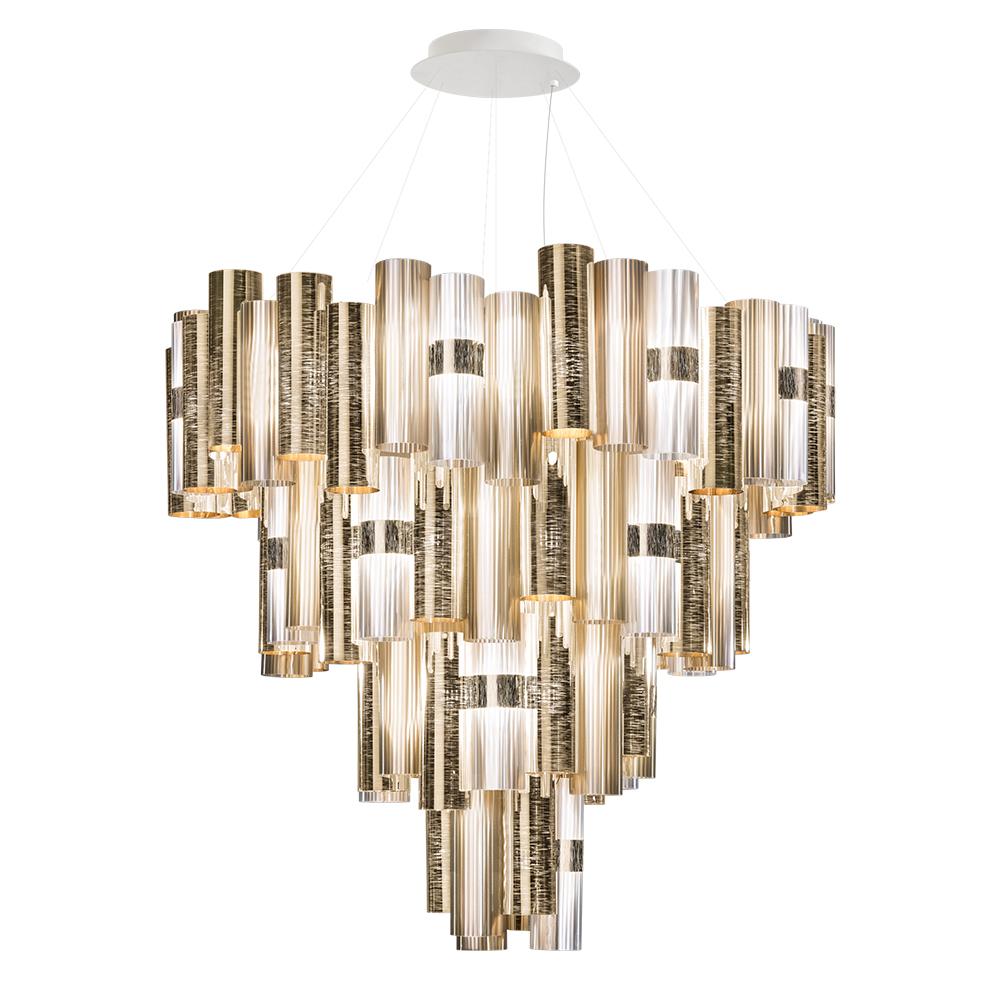 Hommage aux merveilleuses années 1950. La Lollo et La Lollona réveillent dans l’imaginaire une histoire de divas et de projecteurs. Gradients chromatiques, métallisation, dentelles et motifs géométriques décorent les intérieurs avec la même modularité que celle d’un bijou ornant le corps d’une femme. La Lollona 5 arrive à 130 cm de diamètre pour un total de 132 cylindres réalisés avec les technopolymères uniques et exclusifs de Slamp. Facile à installer, extraordinaire à admirer !