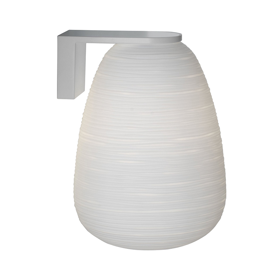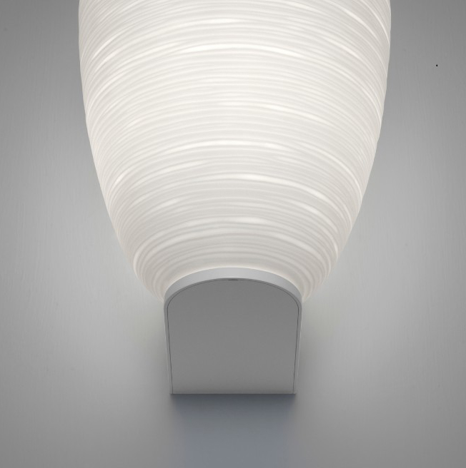 Rituals Foscarini est la rencontre entre Orient et Occident, entre mémoire et contemporanéité, inspiration poétique et recherche technologique. Une famille de formes distinctes et complémentaires qui translate la magie lumineuse des lanternes orientales en papier de riz dans la texture précieuse du verre soufflé. L'aspect particulier du verre, dont la surface est sillonnée par des lignes irrégulières, a été obtenu grâce à l'industrialisation du processus artisanal du meulage. Résultat : des motifs doux et séduisants qui créent une impression unique de clair-obscur et une lumière douce et tamisée. Caractérisée par une forte présence, la monture des versions d'applique Rituals frappe dès le premier regard. Réalisée en métal laqué époxy blanc, elle présente une formée carrée et déterminée, qui contraste avec le volume arrondi, éthéré et les finitions irrégulières du diffuseur en verre soufflé, comme les deux aspects complémentaires d'une personnalité unique, le côté technique d'une part et le côté émotionnel de l'autre. Semblable au piédestal d'une œuvre d'art, la monture présente le verre soufflé dans toute son intégrité, à 360°, soulignant la luminosité particulière de cette lampe. Sa forme en L renversé, qui permet différentes solutions d'installation, vers le haut ou vers le bas, soutient le diffuseur, disponible en deux dimensions, comme s'il s'agissait d'une lanterne, ou semble le faire fluctuer dans l'air. Sur demande, une version avec deux diffuseurs est disponible : l'un au-dessus du support mural, l'autre en dessous.