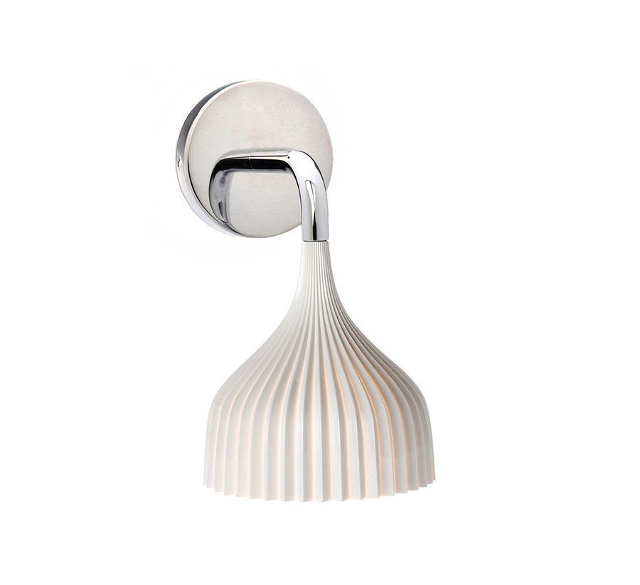Une lampe du design simple et essentiel, disponible en deux versions: applique et suspension. L'applique est composé d'un diffuseur à la rosace en policarbonato plissé, disponible en couleur plus variante et un bras en métal chromé de la longueur de 11 cms. Ampoule incluse: E14 Max 5W Led 2700°K