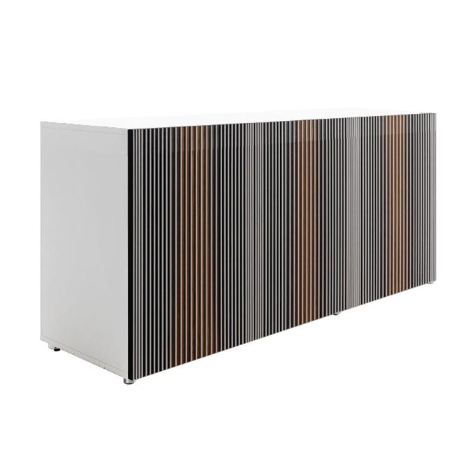 Structure et étagères en panneaux de particules de bois plaqués et teintés ou mélaminés et laqués. L’épaisseur de la structure est de 18 mm, celle du panneau de fond de 10 mm et celle du séparateur vertical fixe de 36 mm. Portes constituées d’un panneau en nid d’abeilles MDF avec des renforcements transversaux internes en métal, plaquées thermotraitées en chêne et broyées verticalement pour accueillir des inserts verticaux en lamifié blanc. Des étagères en verre trempé transparent, à bord poli, d’une épaisseur de 5 mm. Butées en PVC ou en feutre. Pieds régables en ABS peint à finition aluminium. Piétement en option d’une hauteur de 16 cm ou 32 cm, en fer peint en poudres. Accessoirs optionales: plateau amovible.