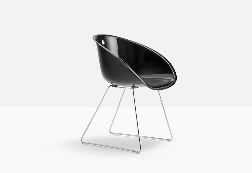 Gliss Pedrali a une forme enveloppante et ergonomique inspirée aux sièges emblématiques des années 1950 et se caractérise par l’élément distinctif du trou dans la coque. La collection est confortable et fonctionnelle grâce à la forme sinueuse des accoudoirs qui entourent la personne assise comme dans un câlin et qui favorisent la prise de main pour le déplacement. Fauteuil avec coque en polycarbonate et structure en luge avec fil en acier Ø 10 mm.