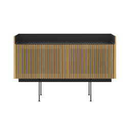 Collection de buffets, commodes et meubles de télévision lauréats du prix Red Dot 2015 avec une finition spéciale d’aluminium en partie supérieure.
