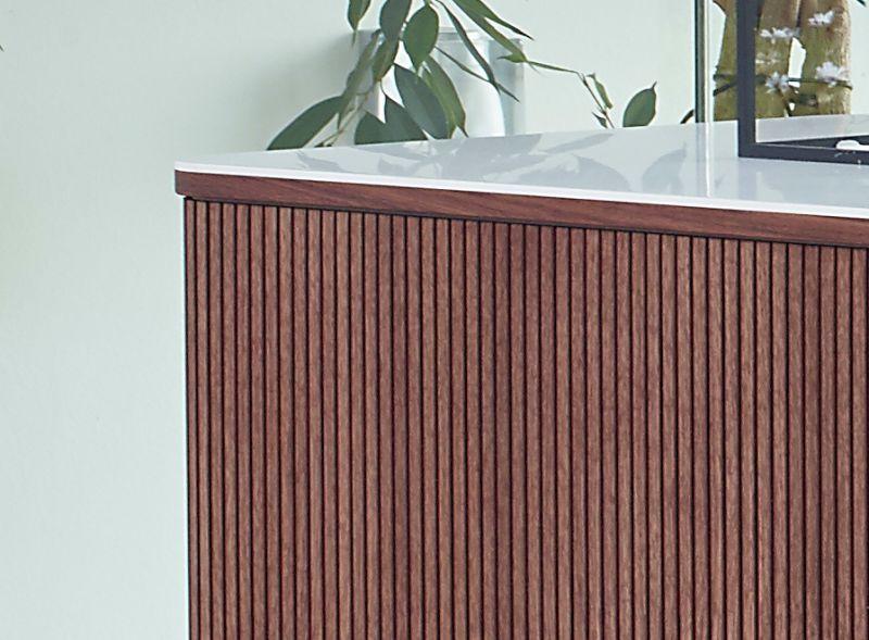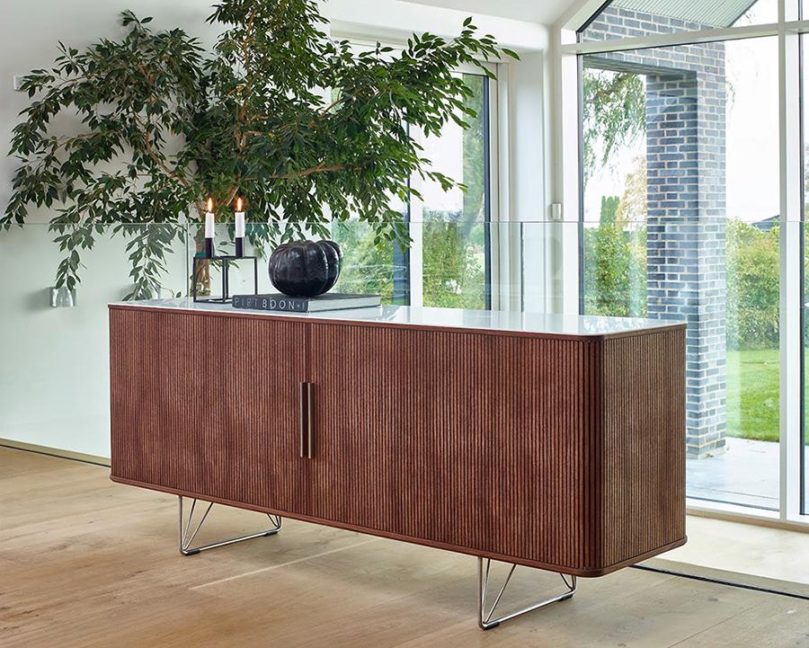 Buffet avec plateau en Corian blanc et portes de volets roulants, poignées et base en acier inox. C'est une nouvelle interprétation du design classique. Le buffet a trois compartiments. Au centre avec deux plateaux et les autres deux avec plateaux réglables. Dimensions: 180 x 46 x 74 cm. Délai de livraison: 12 semaines.