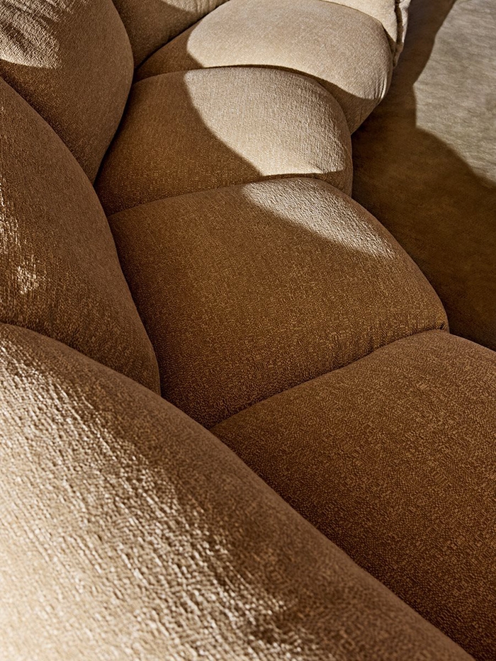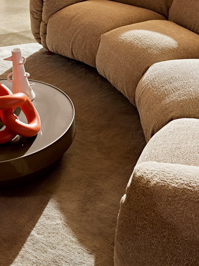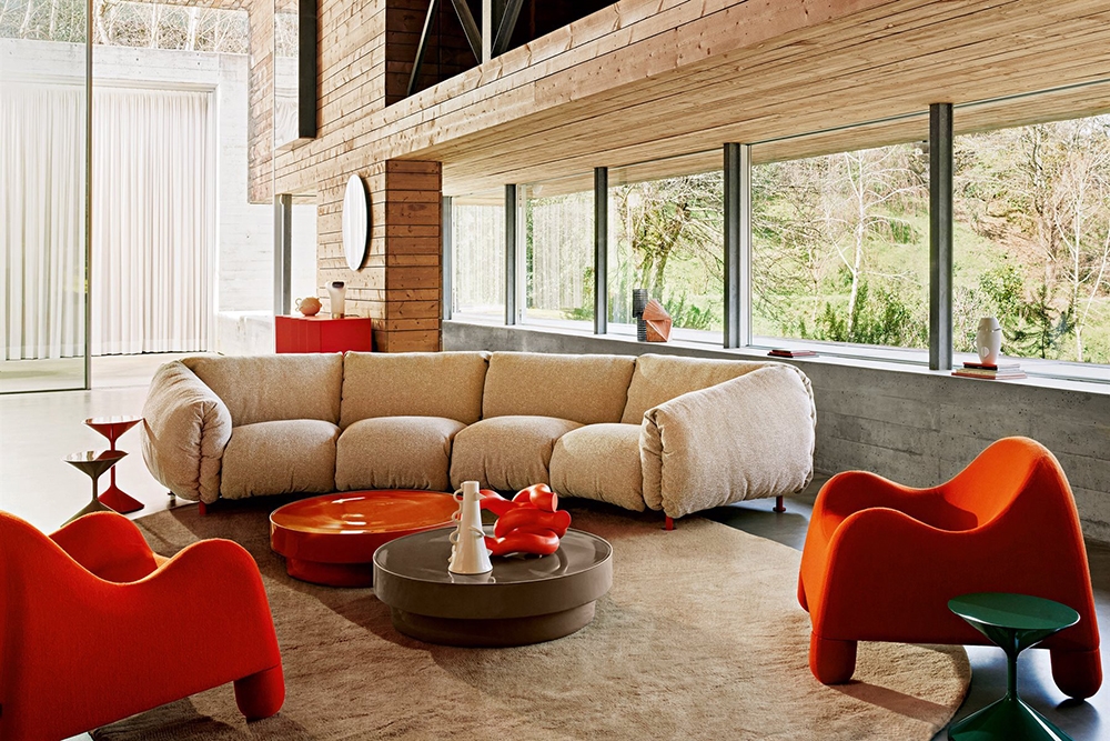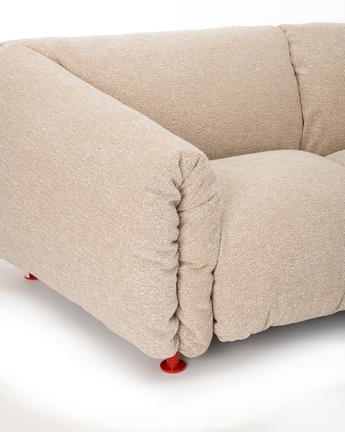 Za:Za Zanotta est une collection de canapés monoblocs lauréate du XXVIII Compasso D'Oro. Structure portante en acier peint orange, amarante, vert gazon ou noir équipée de sangles rigides en polyester anthracite pour soutenir les coussins. Coussins d'assise, dossier et accoudoirs en polyuréthane/ sphères de polyester régénéré et régénérable. Assemblage de rembourrage sans colles. Housse en tissu amovible.