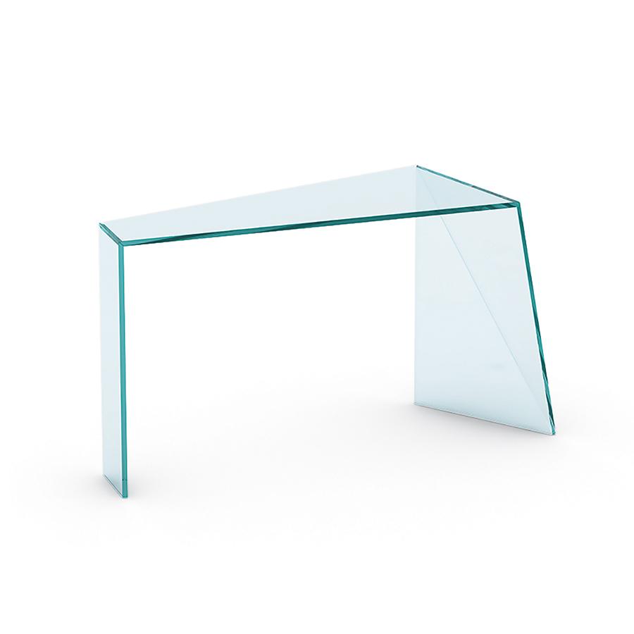 La console Penrose Tonelli Design, réalisée par Isao Hosoe avec Lucia Fontana et Masaya Hashimoto, semble se tenir sur un seul point. Par le collage de plaques de verre, finement finies dans le coupe oblique de chaque bord, on crée une magie: le verre devient léger ou il se plie sur lui-même en restant en équilibre parfait. La console Penrose est la métaphore esthétique et fonctionnelle du défi de l'homme de vouloir dépasser la nature et ses équilibres par l'utilisation du verre. Elle est disponible avec structure en verre transparent ou extraclair à la forme asymétrique avec soudure oblique sur le côté. Charge admise 40 kg.
