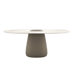 La Qeeboo Cobble Table conçue par Elisa Giovannoni se caractérise par une base centrale où il est possible d'insérer un seau contenant des plantes ou de la glace pour garder les bouteilles au frais. Le plateau fin de la table est fourni dans des matériaux adaptés à une utilisation extérieure ou intérieure. Disponible avec diamètre supérieur 160 et 190 cm.