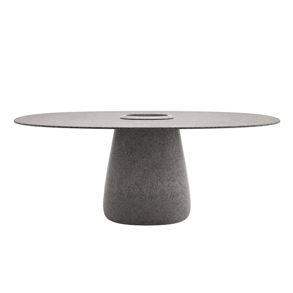 La Qeeboo Cobble Table conçue par Elisa Giovannoni se caractérise par une base centrale où il est possible d'insérer un seau contenant des plantes ou de la glace pour garder les bouteilles au frais. Le plateau fin de la table est fourni dans des matériaux adaptés à une utilisation extérieure ou intérieure. Disponible avec diamètre supérieur 160 et 190 cm.