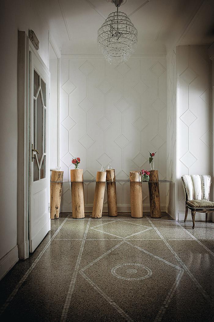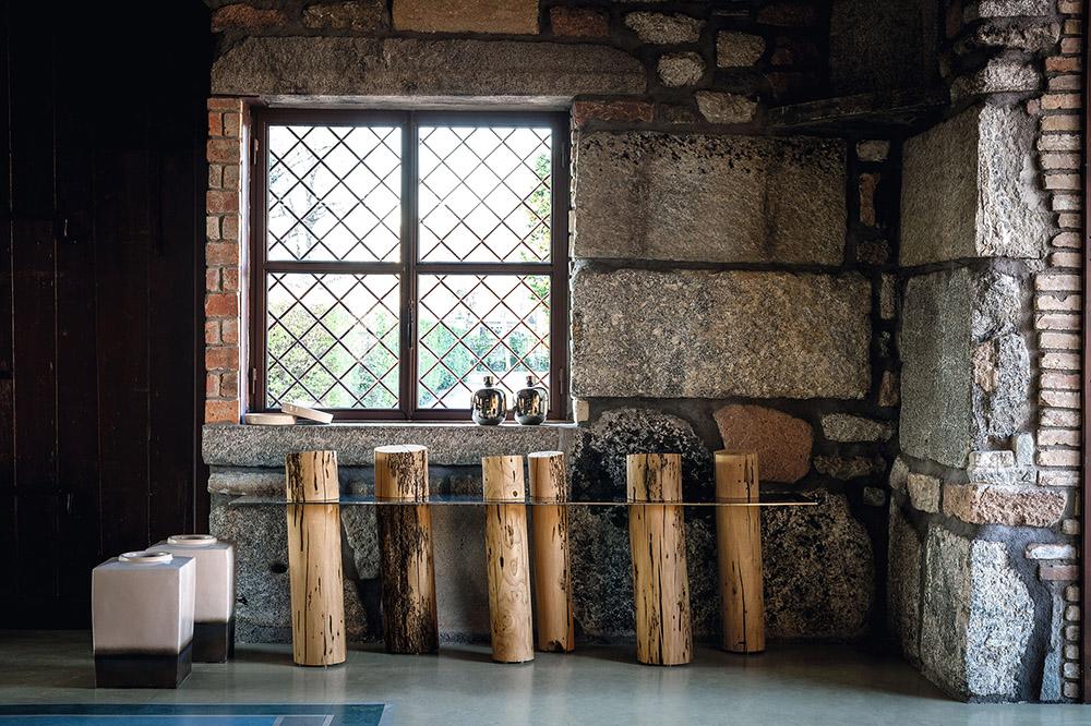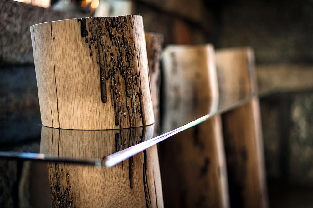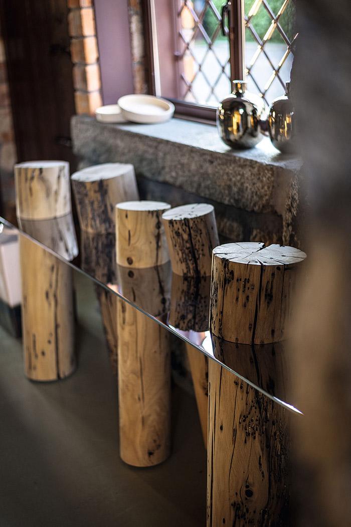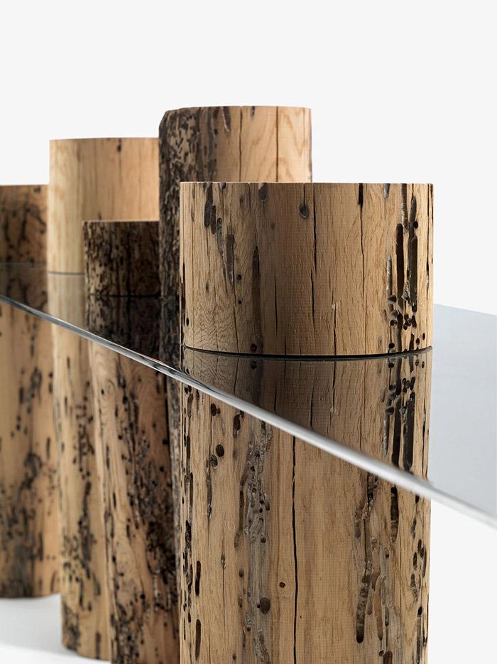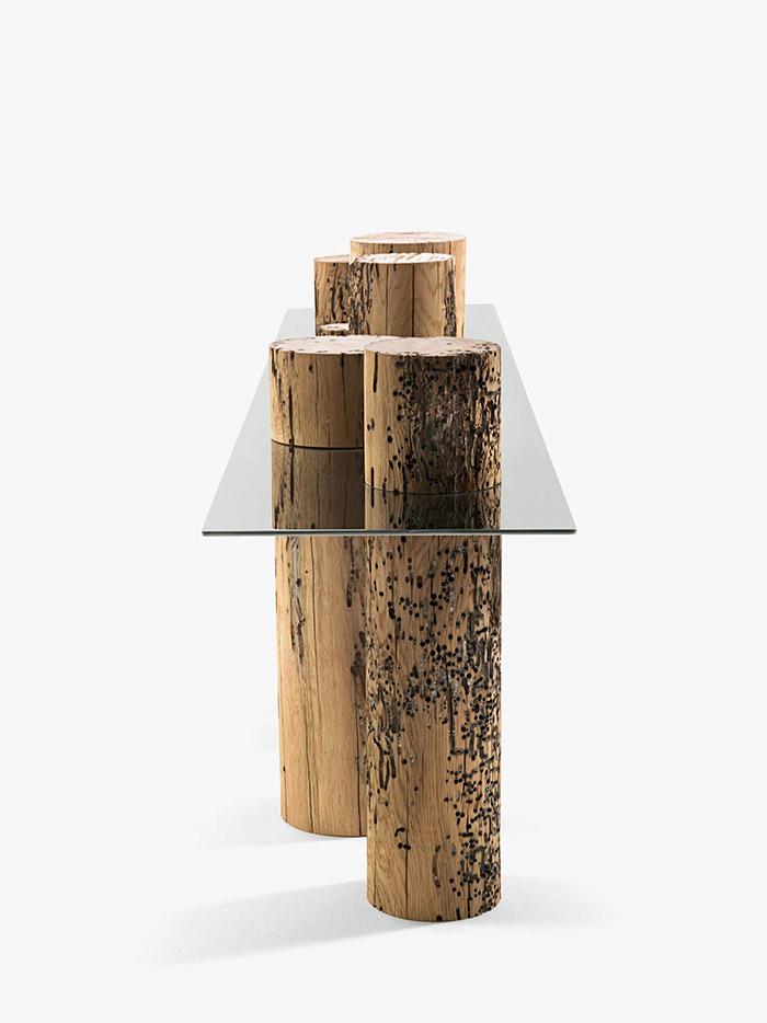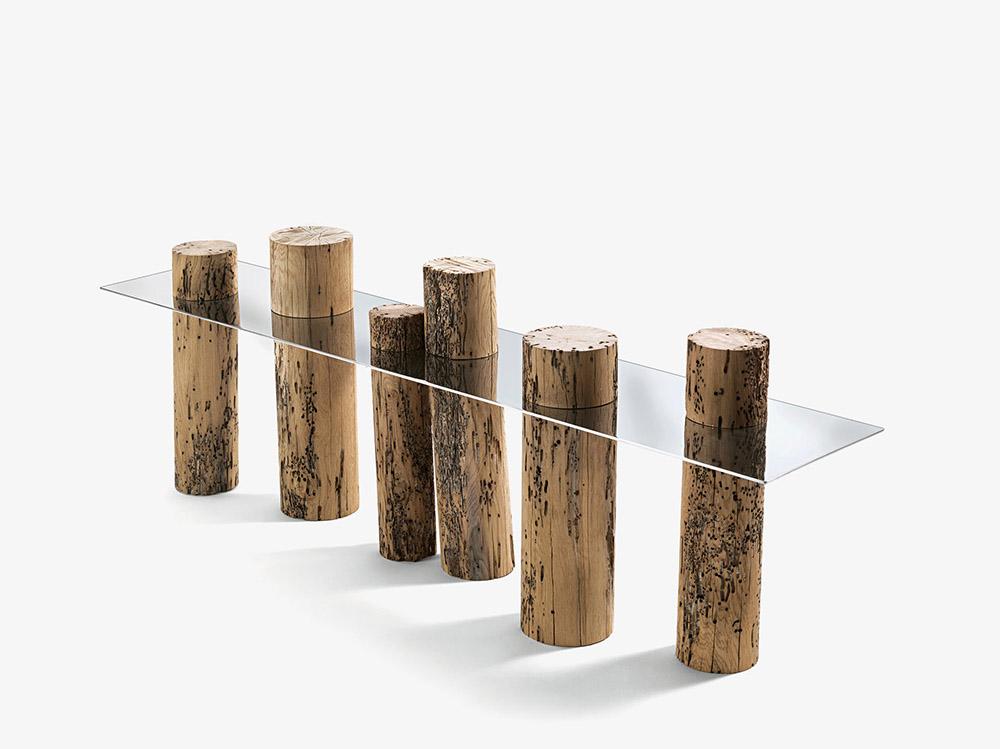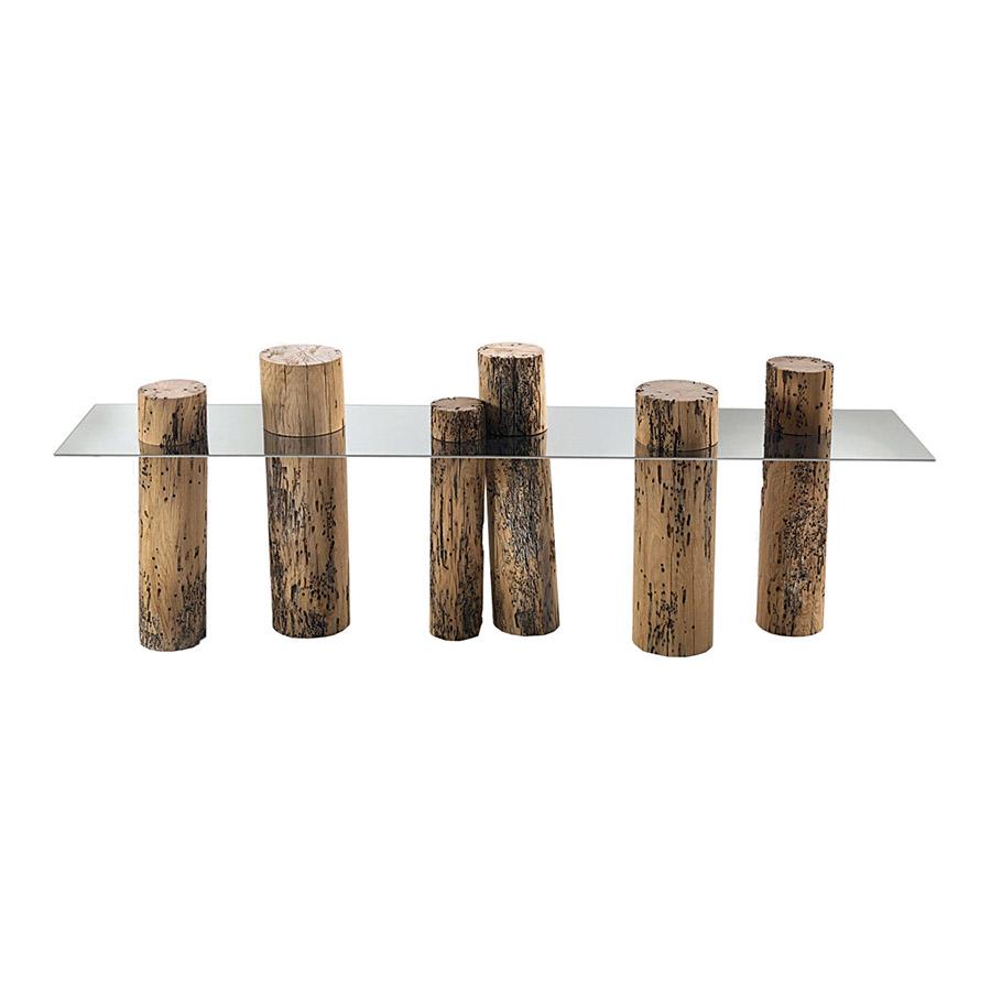 La console Venice Riva 1920 est caractérisée par un plateau en acier brillant (aussi disponible dans la version en verre extra clair et verre "stopsol") combiné à une série de mâts réalisés en bois massif de Briccola, mâts désaffectés provenant de la Lagune de Venise.