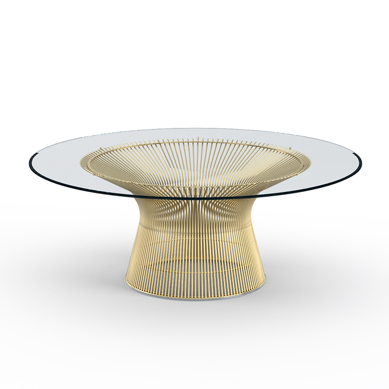 Knoll Platner est une collection réalisée par Warren Platner en 1962. Idéale pour un coin salon dans un bureau ou dans une maison. Disponible en version table à manger, guéridon et table basse. Le piètement est composé d'un faisceau de fils d'acier cintrés, soudés sur des cadres cintrés horizontaux en acier profilé. Finition nickel brillant avec vernis clair de protection, bronze métallisé ou or 18k. La base du piétement est un anneau de protection en profilé plastique, transparent. Le plateau est en verre trempé ou marbre.