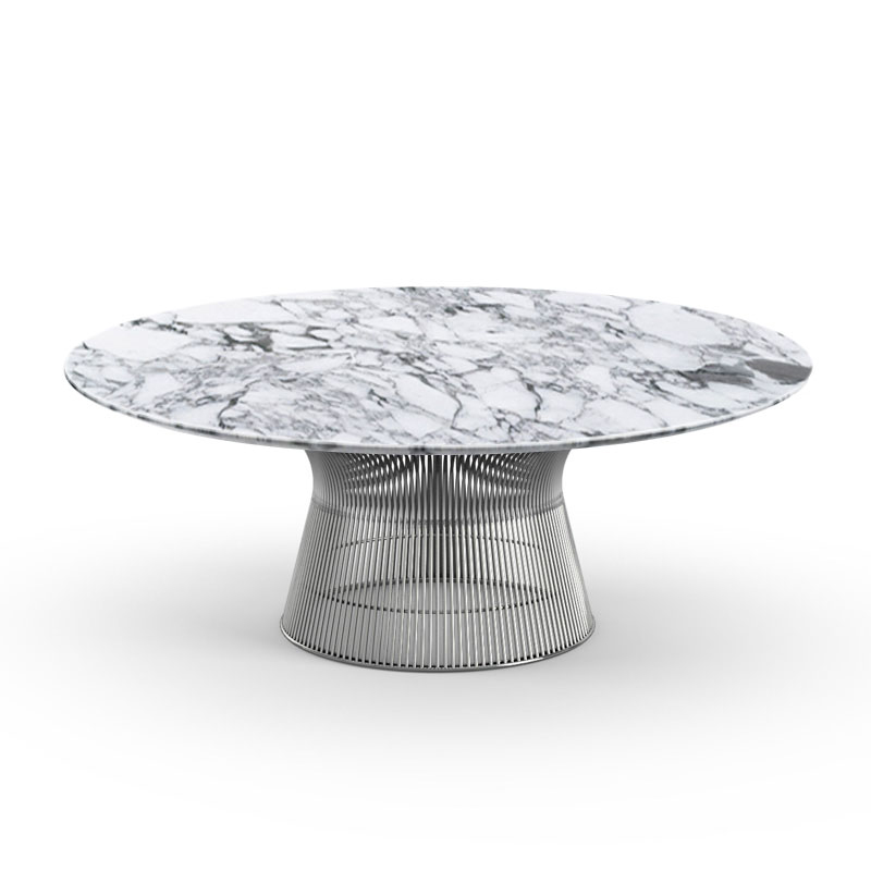 Knoll Platner est une collection réalisée par Warren Platner en 1962. Idéale pour un coin salon dans un bureau ou dans une maison. Disponible en version table à manger, guéridon et table basse. Le piètement est composé d'un faisceau de fils d'acier cintrés, soudés sur des cadres cintrés horizontaux en acier profilé. Finition nickel brillant avec vernis clair de protection, bronze métallisé ou or 18k. La base du piétement est un anneau de protection en profilé plastique, transparent. Le plateau est en verre trempé ou marbre.