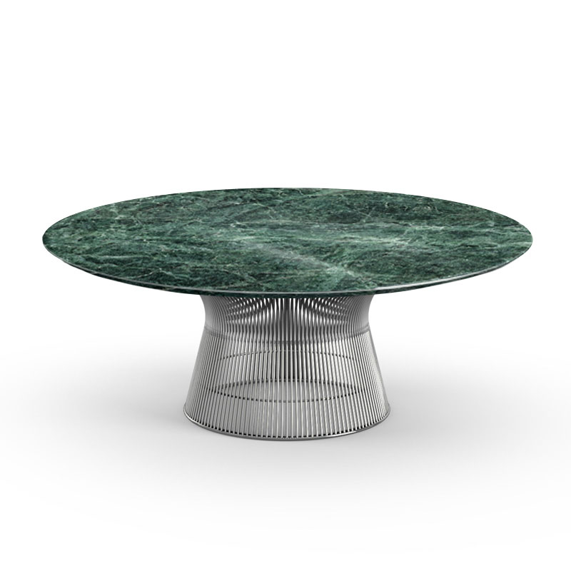 Knoll Platner est une collection réalisée par Warren Platner en 1962. Idéale pour un coin salon dans un bureau ou dans une maison. Disponible en version table à manger, guéridon et table basse. Le piètement est composé d'un faisceau de fils d'acier cintrés, soudés sur des cadres cintrés horizontaux en acier profilé. Finition nickel brillant avec vernis clair de protection, bronze métallisé ou or 18k. La base du piétement est un anneau de protection en profilé plastique, transparent. Le plateau est en verre trempé ou marbre.
