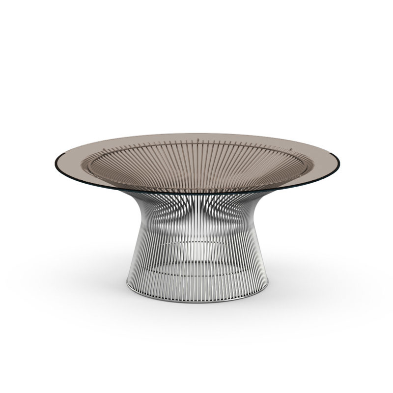 Knoll Platner est une collection réalisée par Warren Platner en 1962. Idéale pour un coin salon dans un bureau ou dans une maison. Disponible en version table à manger, guéridon et table basse. Le piètement est composé d'un faisceau de fils d'acier cintrés, soudés sur des cadres cintrés horizontaux en acier profilé. Finition nickel brillant avec vernis clair de protection, bronze métallisé ou or 18k. La base du piétement est un anneau de protection en profilé plastique, transparent. Le plateau est en verre trempé ou marbre.