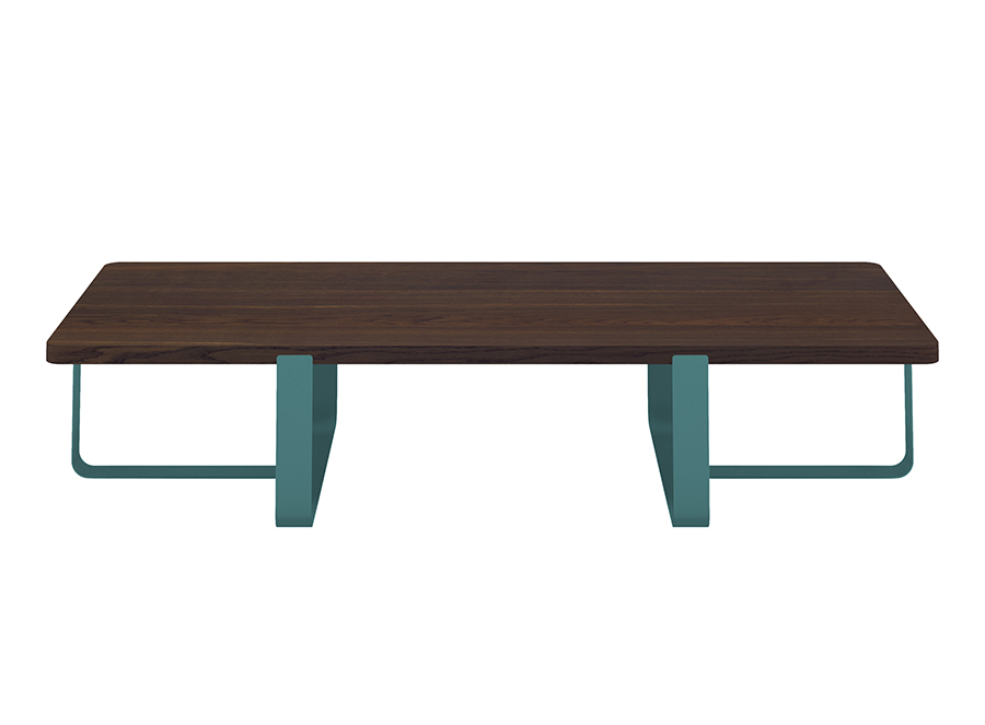 Inn Meme Design est une table de salon avec plateau en chêne plaqué tinté fumé et pieds en métal laqué disponibles dans toutes les couleurs de la palette. Un travail soigné de fraisage du plateau pour insérer les pieds a été effectué. Livrée en deux colis, un pour le plateau et un pour le pieds.