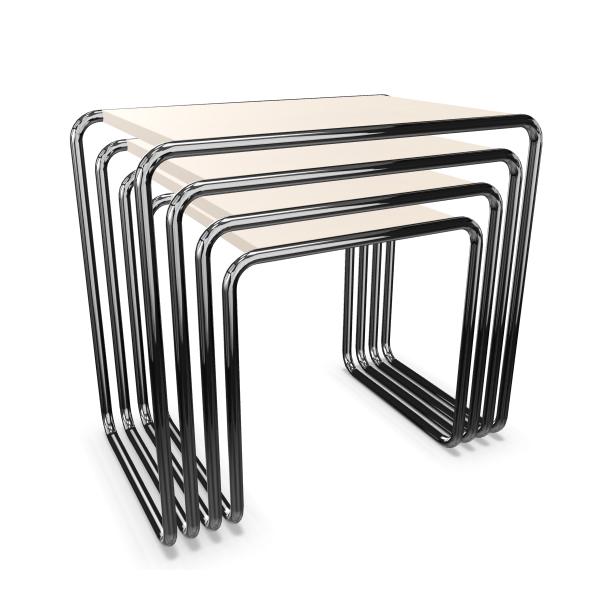 La technique de pliage du bois perfectionnée par Michael Thonet est source d'inspiration pour Marcel Breuer qui commence à expérimenter le pliage du tubulaire d'acier et développe l'idée de ce set composé de quatre tables basses. Extrêmement versatiles, les table basses B 9 sont compléments idéels pour les groupes d'assises, servent de surface d'appui et elles sont parfaites pour vases de fleurs fraîches; après l'utilisation elles peuvent être confortablement mises une sous l'autre pour économiser de l'espace. La particularité de cette collection est dans sa sobriété fonctionnelle: le set de tables basses est en effet réalisé seulement par le tubulaire d'acier courbé et chromé et plateaux rectangulaires.