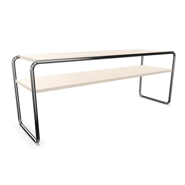 L'endroit idéal pour ranger rapidement vos affaires et les avoir toujours à portée de main. Les tables d'appoint B 10 sont de forme étroite et allongée, mais elles représentent en même temps un élément décoratif qui ne passe inaperçu dans aucun appartement ou bureau. Aujourd'hui l'esthétique linéaire n'est plus une nouveauté, mais à cette époque Marcel Breuer devait lutter contre un style d'habitation chargé et excessivement décoré, encore très répandu dans les années 1920, avant de percer avec ses propres meubles en acier tubulaire, élégants et essentiels. . Après les premières expériences avec l'acier tubulaire, un matériau complètement nouveau dans ces années-là, Breuer a conçu une série de tables dont la table longue et étroite B 10 et a travaillé en même temps sur un projet de chaise innovant. Seul le tube d'acier plié à froid garantissait la stabilité et l'élasticité nécessaires à la création de ces modèles. Les premiers meubles en tube d'acier étaient dotés de pieds et de patins et n'exploitaient pas encore l'effet ressort typique de ce matériau innovant. À partir de 1928, Breuer commença à construire les premiers prototypes de ce qui est aujourd'hui la célèbre chaise cantilever, en s'inspirant du modèle de Mart Stam : une chaise cantilever composée de dix morceaux de tube, tous de même longueur, et reliés par des brides, initialement encore rigide et immobile. Les créations de Breuer sont considérées comme de véritables jalons dans l'histoire du mobilier moderne. Thonet a immédiatement reconnu le potentiel des meubles en tube d'acier et a immédiatement commencé à collaborer avec les designers les plus avant-gardistes, devenant ainsi, dès les années 1930, le premier fabricant mondial de meubles en tube d'acier.