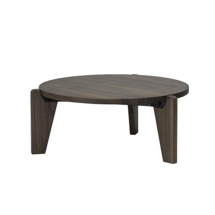 Au début des années 1940, Jean Prouvé s‘intéressa de plus en plus au travail du bois. Ainsi le lourd plateau en bois de la table Guéridon Bas repose sur trois pieds en chêne massif. Ces éléments sont reliés entre eux par une structure composée de tôle pliée. En souvenir d‘une version en bois tropical nommée alors « Table africaine », Guéridon Bas est également disponible en bois foncé.