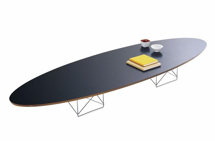 Avec sa silhouette elliptique élégante, cette table basse a rapidement été surnommée « Surfboard Table » (planche de surf) en raison de sa forme. Avec ses deux piètements chromés, la table reprend un thème varié à l’infini par les Eames, les fils d’acier courbés et soudés pour former une structure stable.