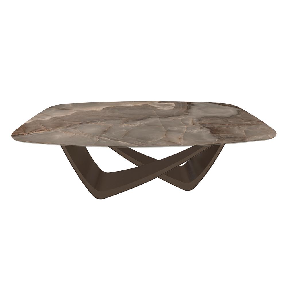 BONTEMPI table fixe tonneau avec structure laiton foncé BACH 53.75 200x116 cm (SuperMarmo Choco lucido - Struttura in acciaio laccato ottone scuro e piano in ceramica e cristallo)