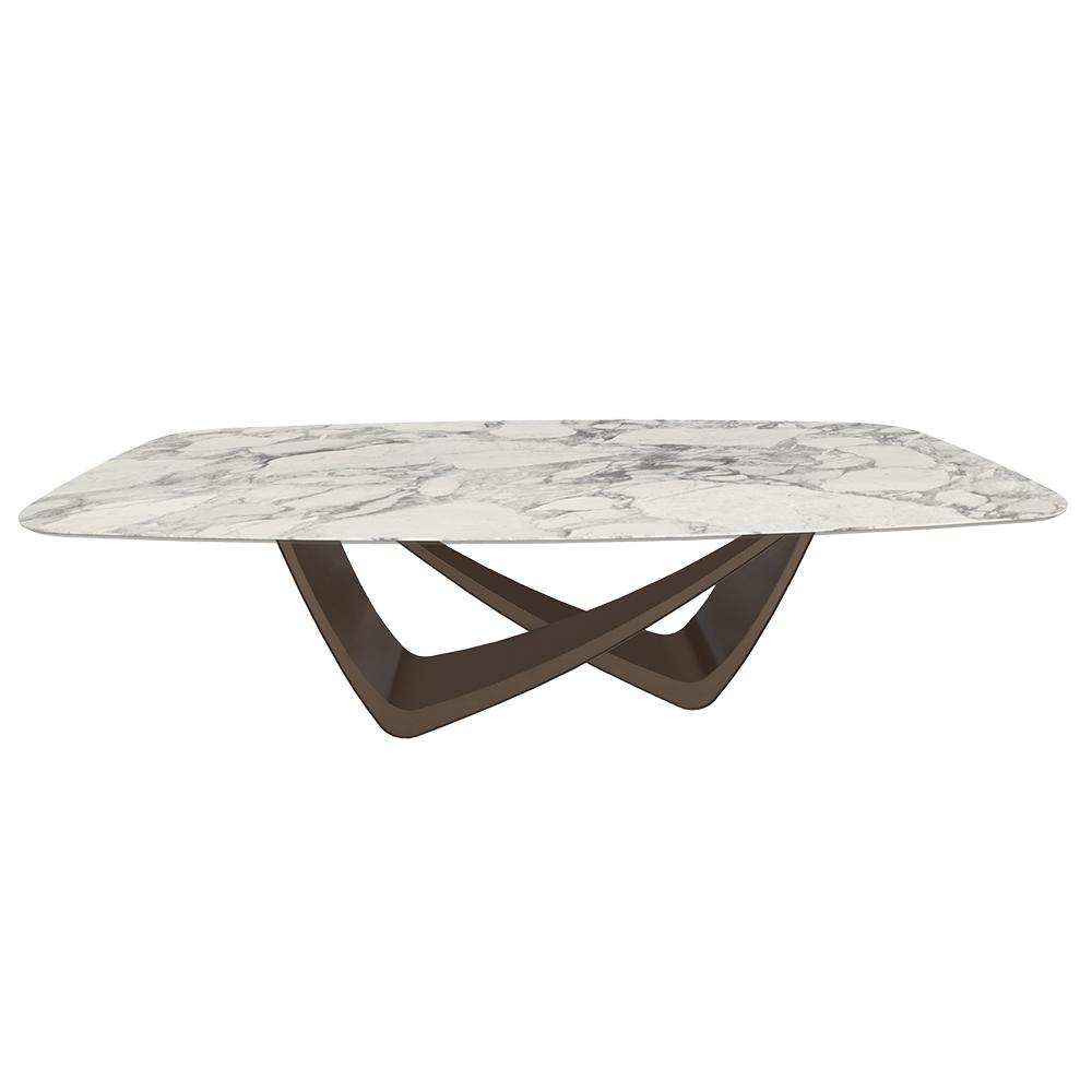 BONTEMPI table fixe tonneau avec structure laiton foncé BACH 53.76 250x120 cm (SuperMarmo Arabescato lucido lucido - Struttura in acciaio laccato ottone scuro e piano in ceramica e cristallo)