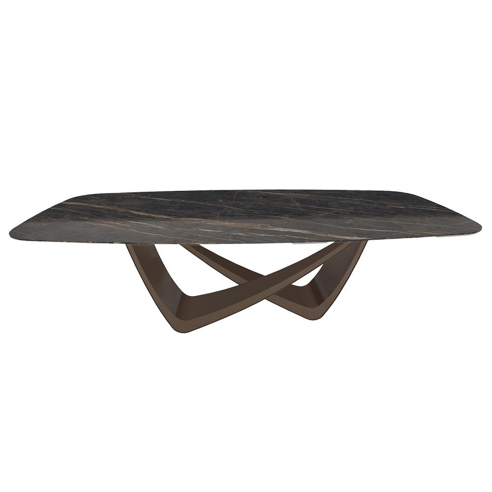 BONTEMPI table fixe tonneau avec structure laiton foncé BACH 53.76 250x120 cm (SuperMarmo Noir Desir lucido - Struttura in acciaio laccato ottone scuro e piano in ceramica e cristallo)