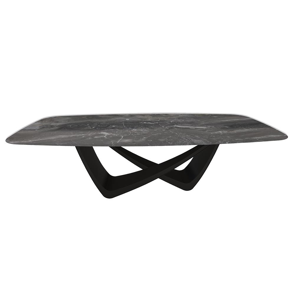 BONTEMPI table fixe tonneau avec structure noire matte BACH 53.76 250x120 cm (Art Glass Arabescato Imperiale Orobico - Struttura in acciaio laccato nero opaco e piano in cristallo temprato)