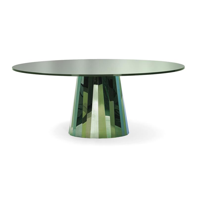 Pied en tôle d’acier inoxydable pliée, polie brillante, décliné en différentes couleurs et coloré suivant un procédé spécial. Plateau de table ovale en verre de cristal, laqué en couleur en son centre ou sur toute la surface, brillant. Ou sur demande plateau de table ovale en marbre Nero Marquina, Emperador Dark, Bianco Carrara ou Nero Portoro, poli et imprégné. Patins gris en feutre, réglables en hauteur.