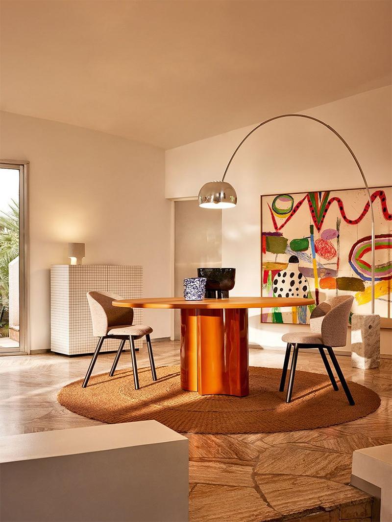 Le projet prévoit des choix chromatiques, avec des teintes contemporaines comme le talc, caramel et vert algues et les finitions : le plateau en MDF est toujours mat, tandis que la base en polyuréthane rigide, en plus du laqué mat, est également disponible en laqué brillant ou métallisé de la même tonalité que le plan, afin de créer un contraste et permettre à la lumière de jouer avec les surfaces, restituant ombres et reflets. La table est donc différente selon le point d’observation et l’interaction avec la lumière.